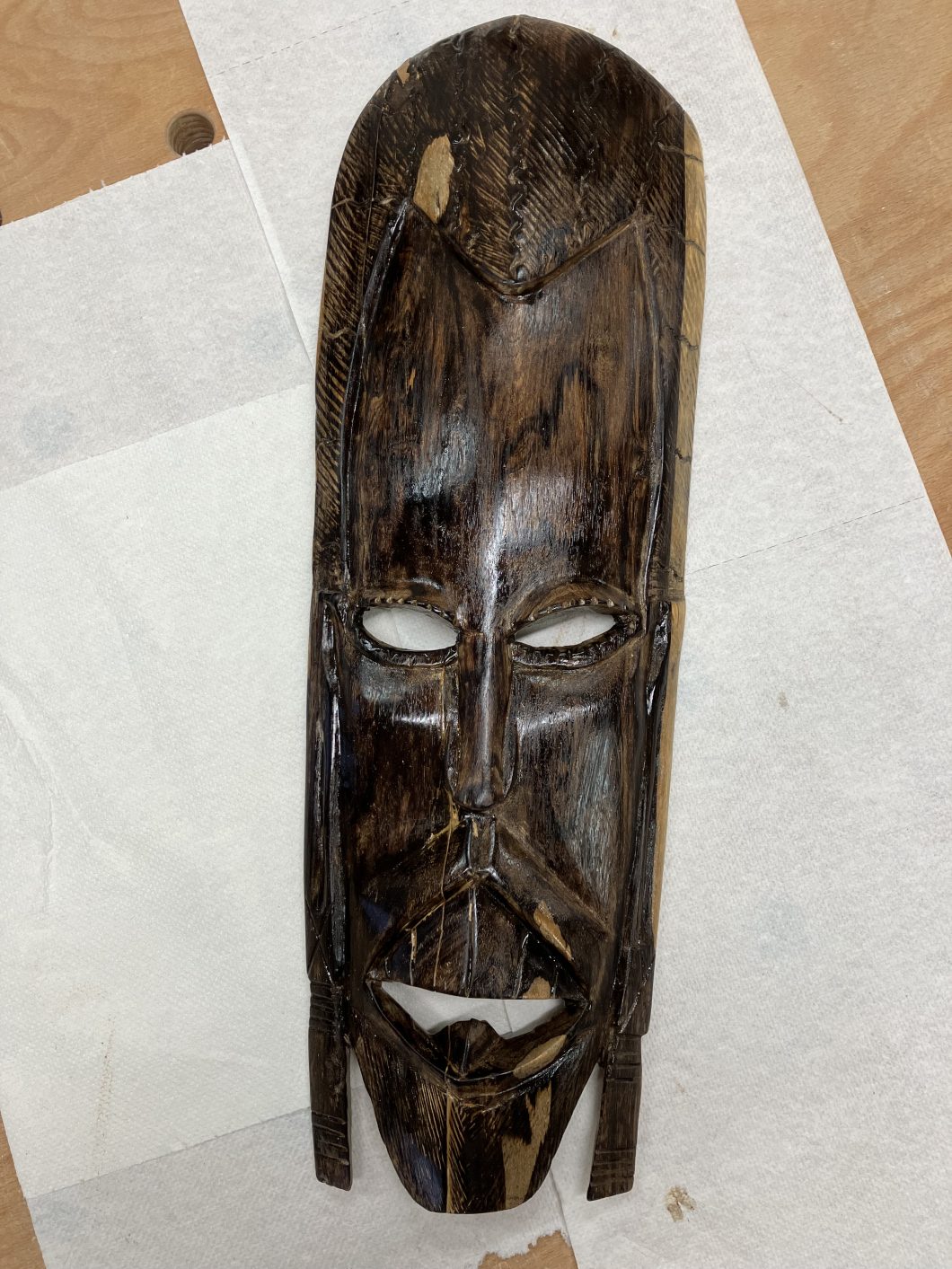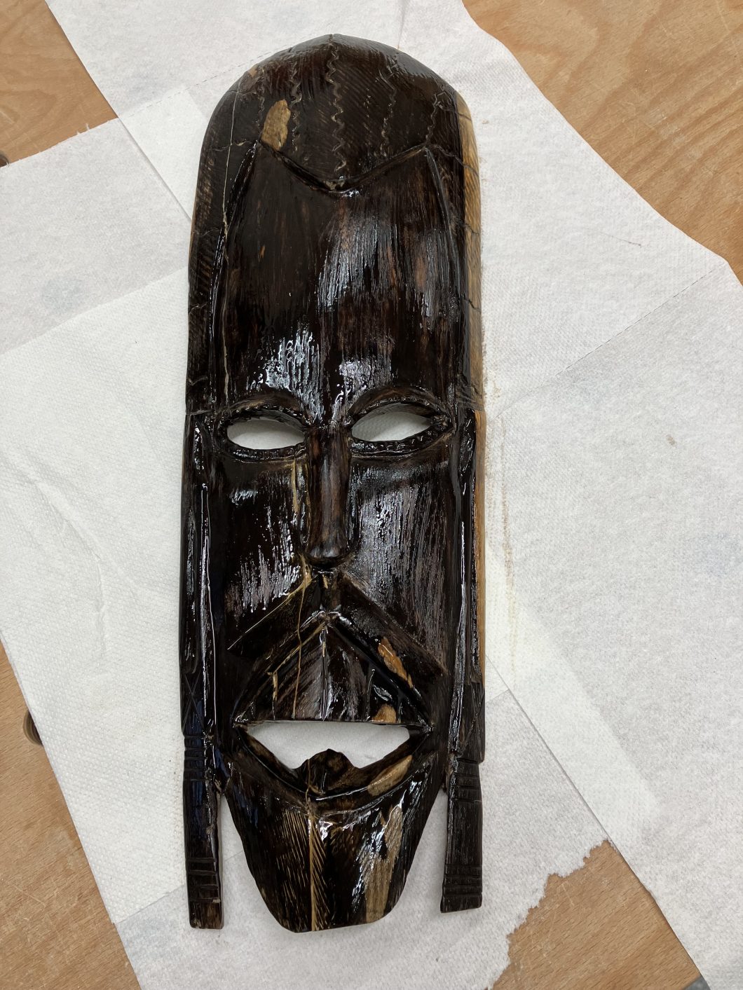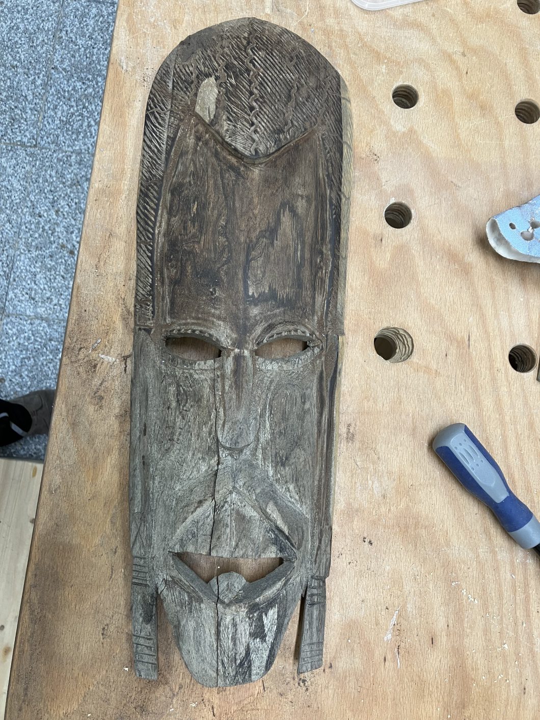 Der Vater meines Freundes hat mich ersucht, diese längs gebrochene Maske zu restaurieren. Sie war ein Mitbringsel seiner Tochter aus Kenia. Schwierig war diese gebrochene, gebogene Maske wieder zu verleimen. Nach dem Schleifen habe ich eine wachsbasierte Lasur verwendet und mich über diese intensiven Farben sehr gefreut (und auch der Auftraggeber–)).