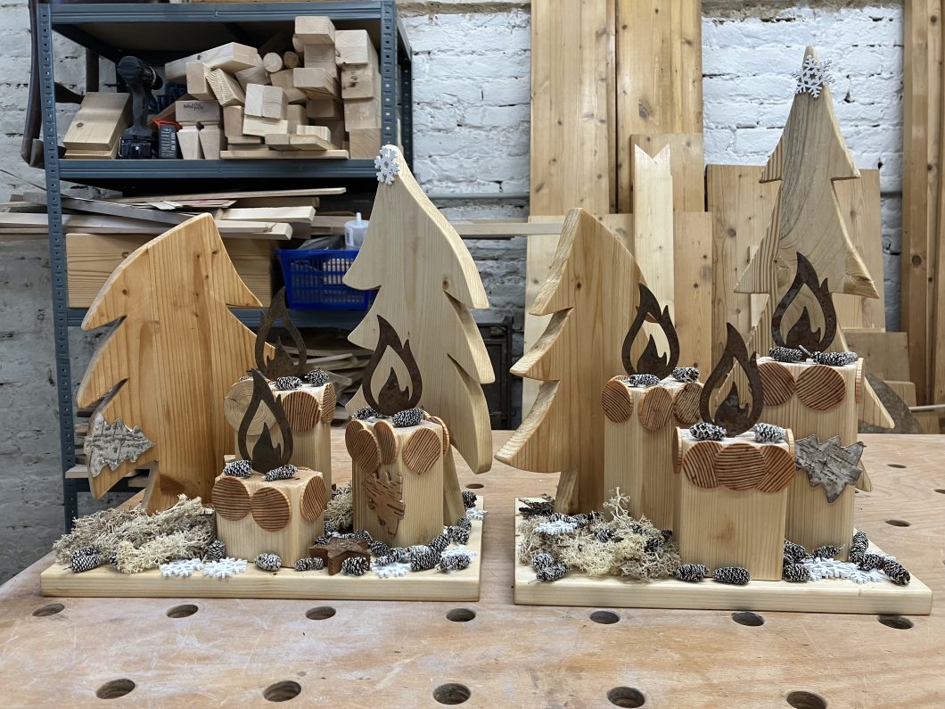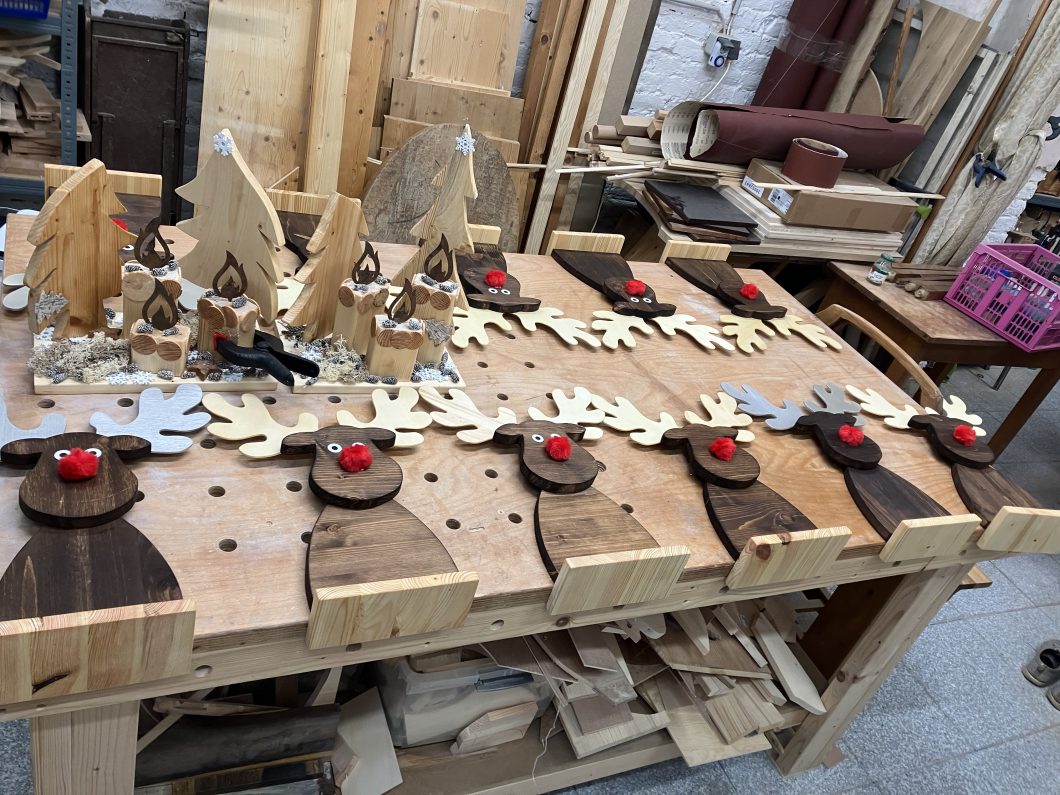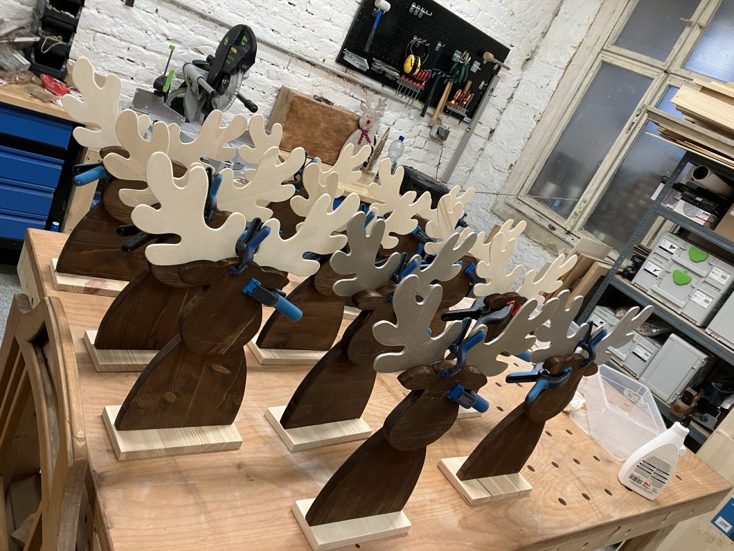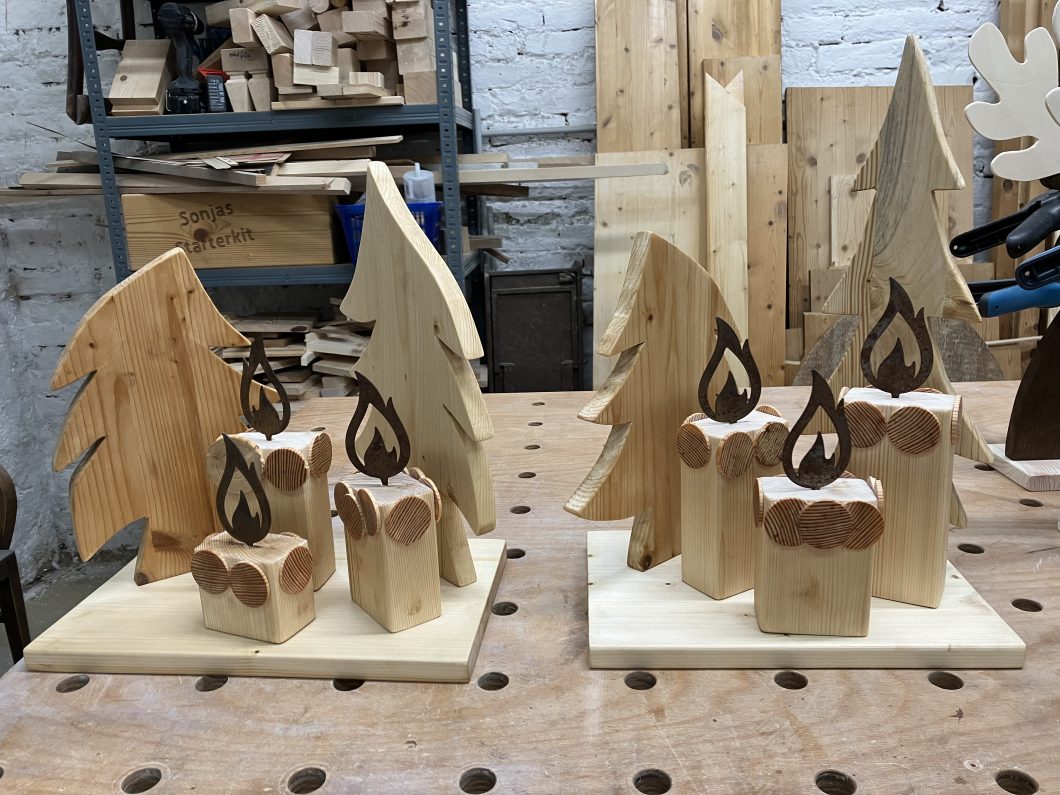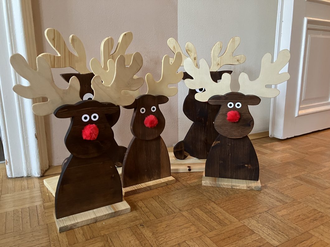 Weihnachtliche Deko ist mittlerweile ein Steckenpferd von mir geworden. Diese Renntiere, Weihnachtswichtel und weihnachtliche Bilder habe ich anhand selbst gemachter Vorlage erstellt. Die Körper sin aus Fichten bzw. Kiefernholz hergestellt und dunkel gebeizt, die Geweihe wurde aus Spanplatte Pappel bzw. Buche erstellt. Die roten Nasen und die Augen sind aufgeklebt. Bei den Wichtel sind die Nasen aus Buchenholt, der Corpus aus Fichte oder Kiefernholz.