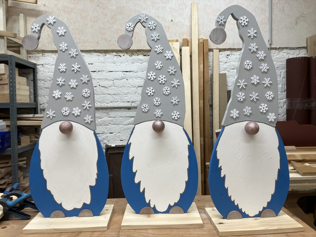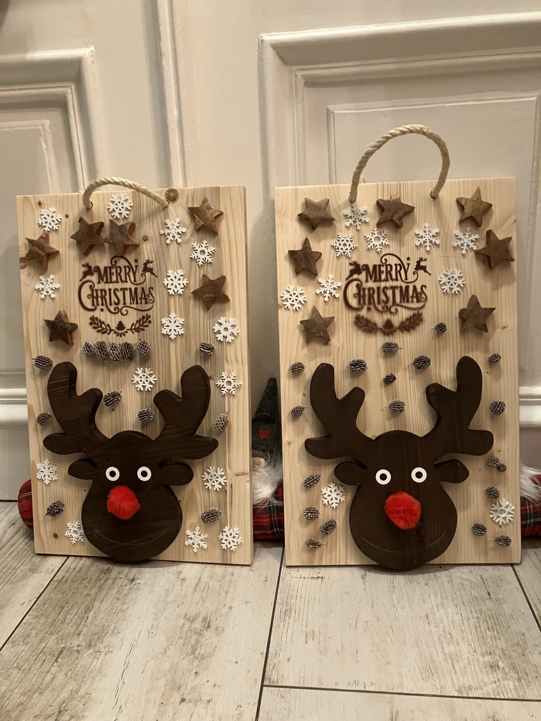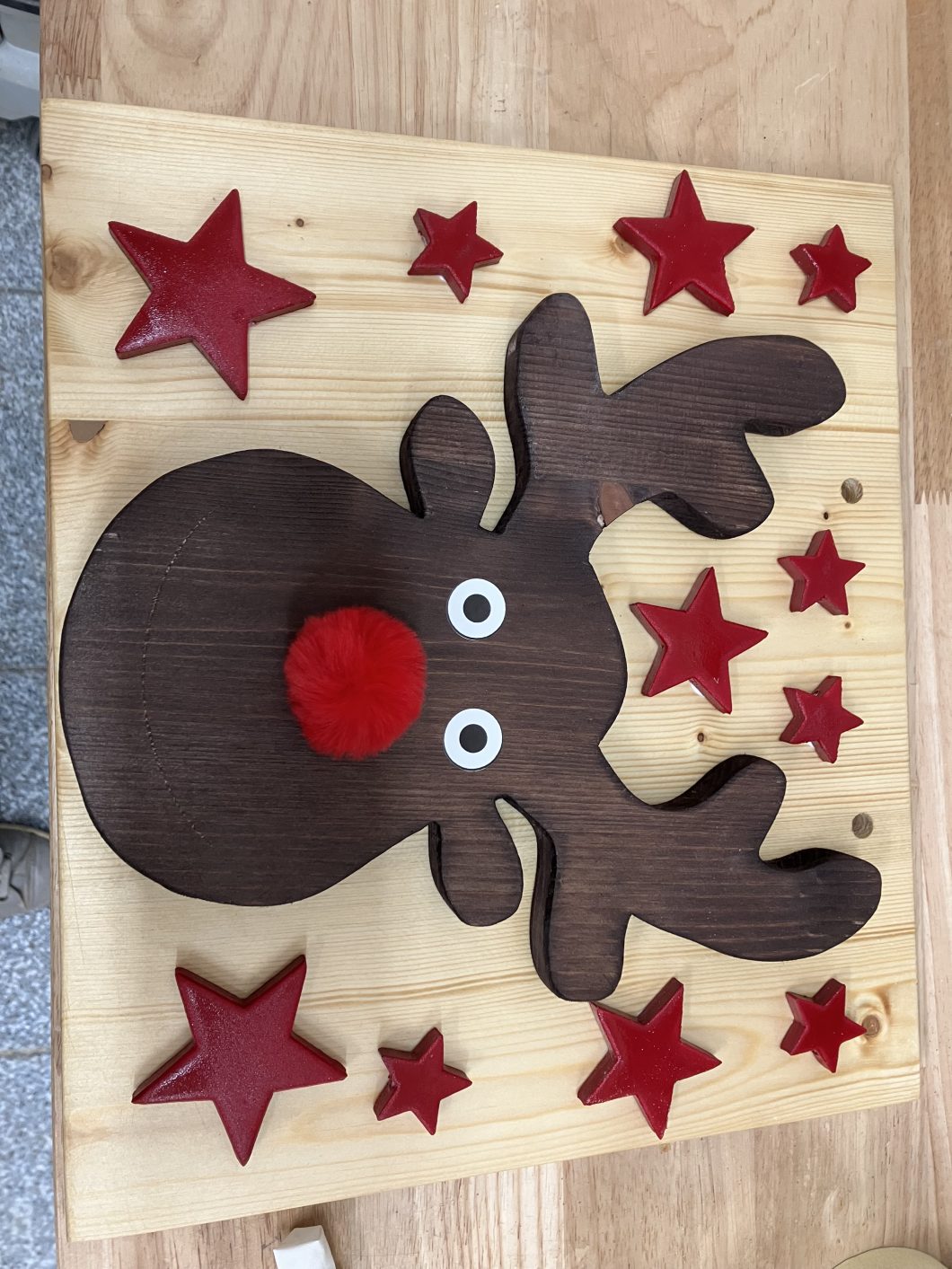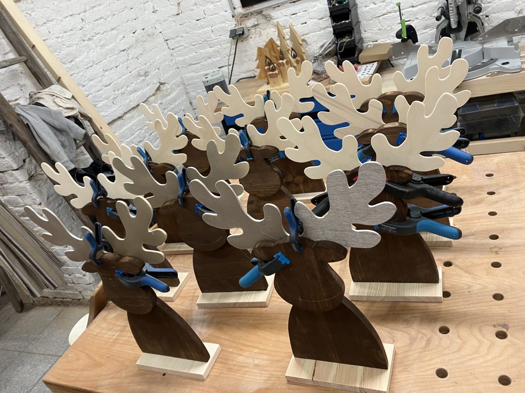 Weihnachtliche Deko ist mittlerweile ein Steckenpferd von mir geworden. Diese Renntiere, Weihnachtswichtel und weihnachtliche Bilder habe ich anhand selbst gemachter Vorlage erstellt. Die Körper sin aus Fichten bzw. Kiefernholz hergestellt und dunkel gebeizt, die Geweihe wurde aus Spanplatte Pappel bzw. Buche erstellt. Die roten Nasen und die Augen sind aufgeklebt. Bei den Wichtel sind die Nasen aus Buchenholt, der Corpus aus Fichte oder Kiefernholz.