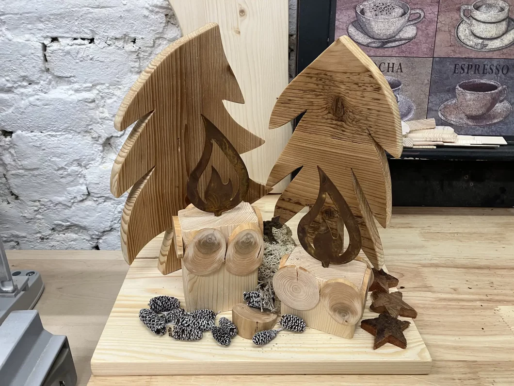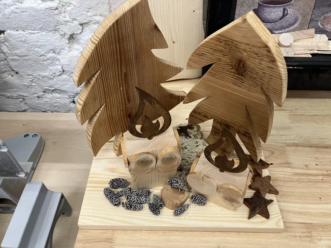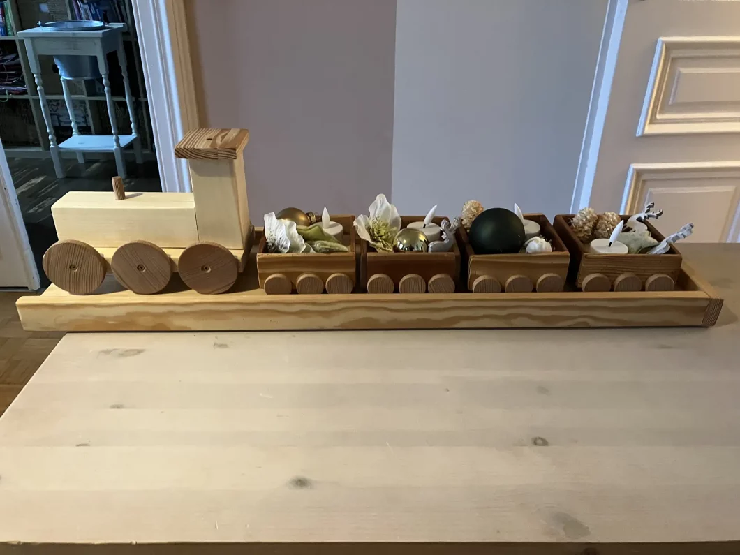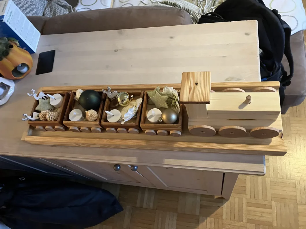 In der Vorweihnachtszeit habe ich mir vorgenommen, eine Reihe von Geschenken aus Holz zu machen. Vor allem Weihnachtsdeko hat es mir angetan. Weihnachtslandschaften, Weihnachtsstiefel oder Weihnachtslaternen standen am Plan. Ein schönes Projekt war der Weihnachtszug, der auch als Adventkranz fungieren kann (hat 4 Waggons). Diesen habe ich einige Male gebaut. Nicht zuletzt habe ich ihn auch als Weihnachtsdeko auf unserem heurigen Weihnachtsbaum verwendet.