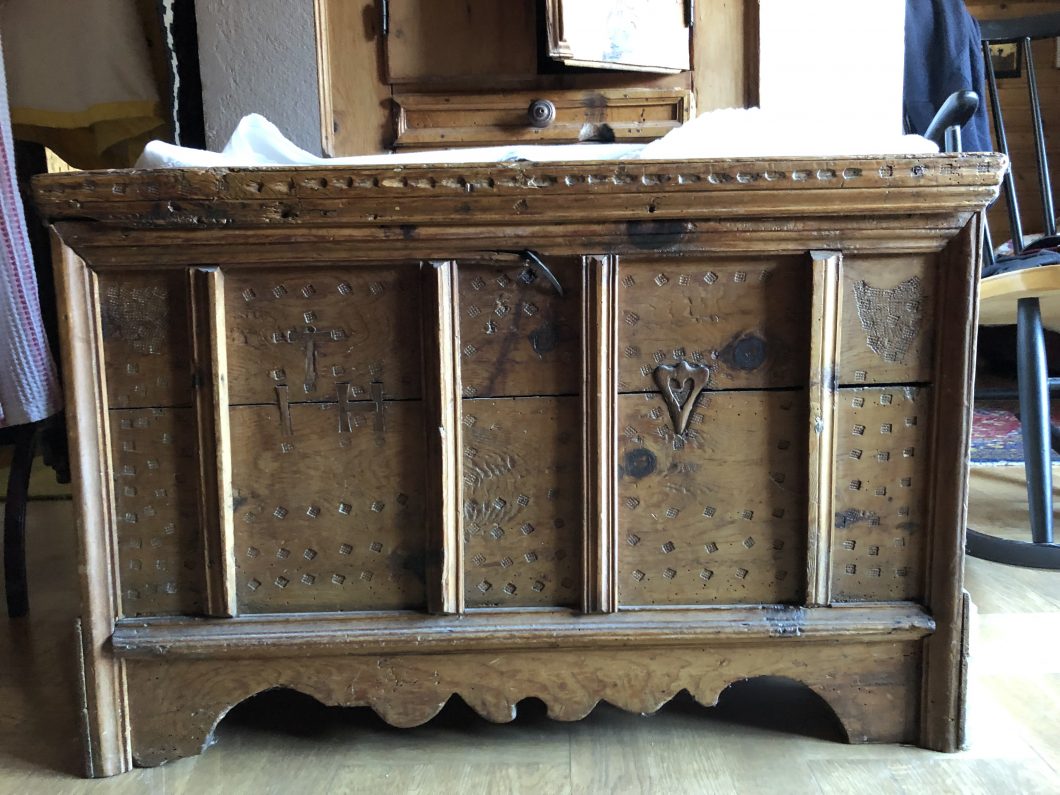 Über die Herkunft ist leider nicht sehr viel bekannt. Die Familie selbst hatte sie seit mehr als 80 Jahren in ihrem Besitz. Auf einem Flohmarkt in OÖ hat mir ein Einheimischer erzählt, dass solche Truhen für das Salzkammergut mit solchen Verzierungen typisch sind. Ich denke, dass Endresultat kann sich sehen lassen. Die Familie war mit der Restauration sehr zufrieden – sie befindet sich heute noch in ihrem Besitz.