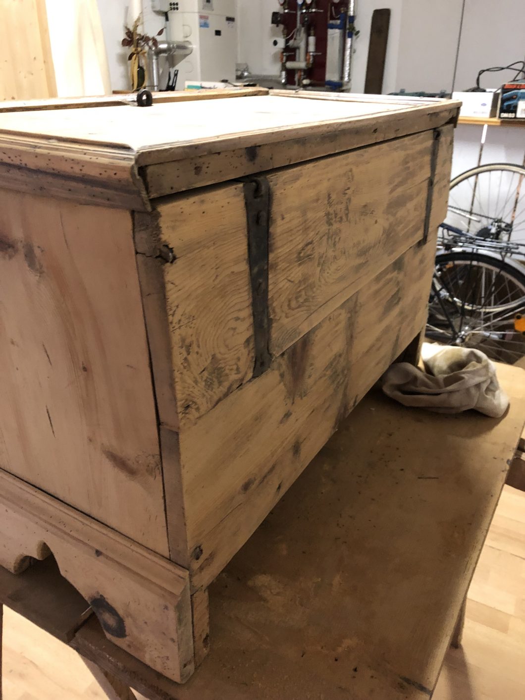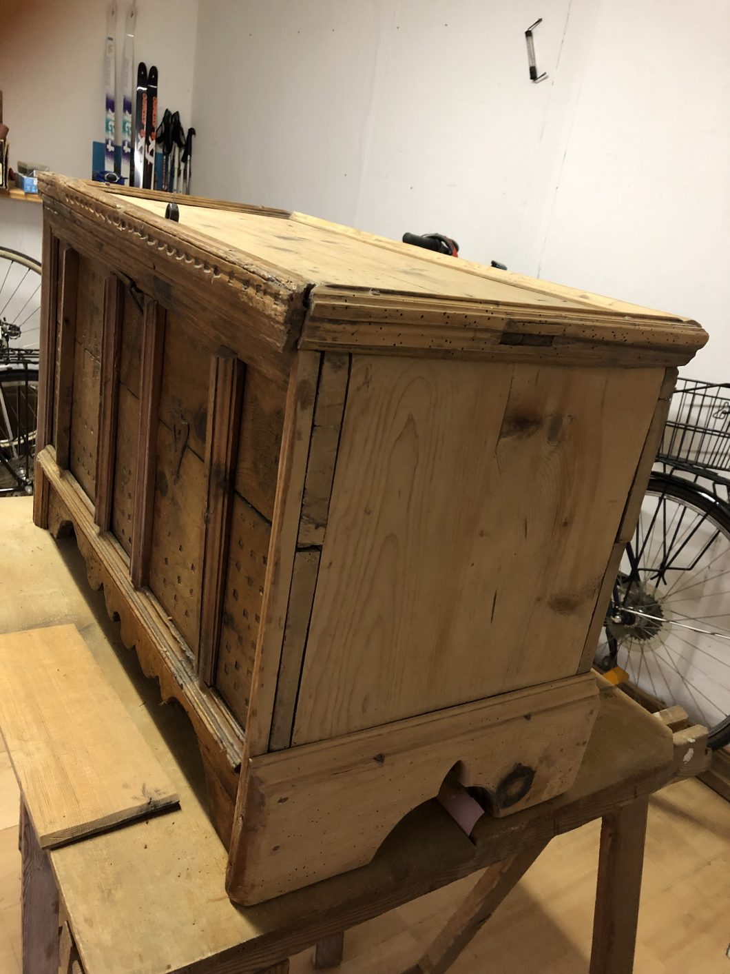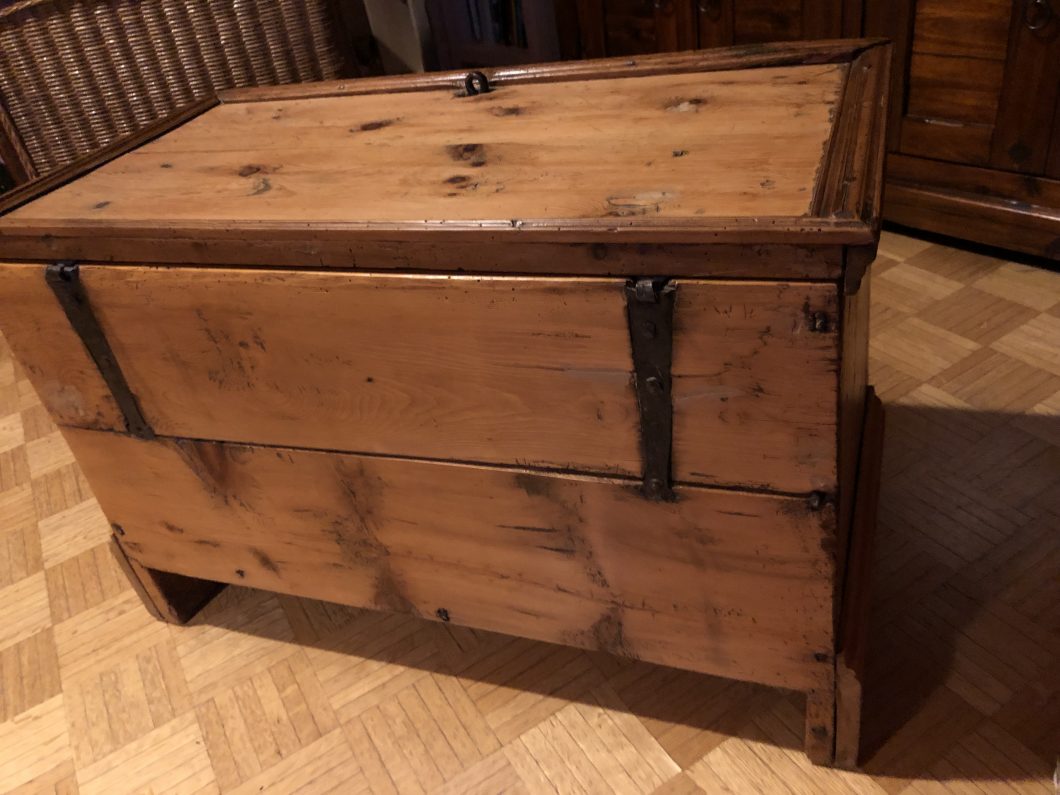 Dies war mein bis dato aufwendigstes Restaurationsprojekt. Die Kiste aus Oberösterreich hatte viele Holzwurmschäden, sehr viele Ecken waren ausgebrochen, abgeschlagen oder von den Holzwürmern zerfressen. Des Weiteren wurde sie schon mal mit neuen Seitenteilen bedacht, die die ursprünglichen Füße stützen sollten (da diese den Holzwürmern zum Opfer gefallen sind). Nachdem unterschiedliche Verzierungen in das Holz gepresst wurden, war Abschleifen auf der Vorderseite keine Option. Ich probierte es mit Abbeize – stellte jedoch rasch fest, dass die ursprüngliche Farbe wasserbasierend sein musste, da die Beize nicht griff. Somit entschied ich mich die Vorderseite vorsichtig mit Hand zu schleifen. Risse und Bruchstellen wurden mit Holzkitt bzw. Wachs behandelt.
