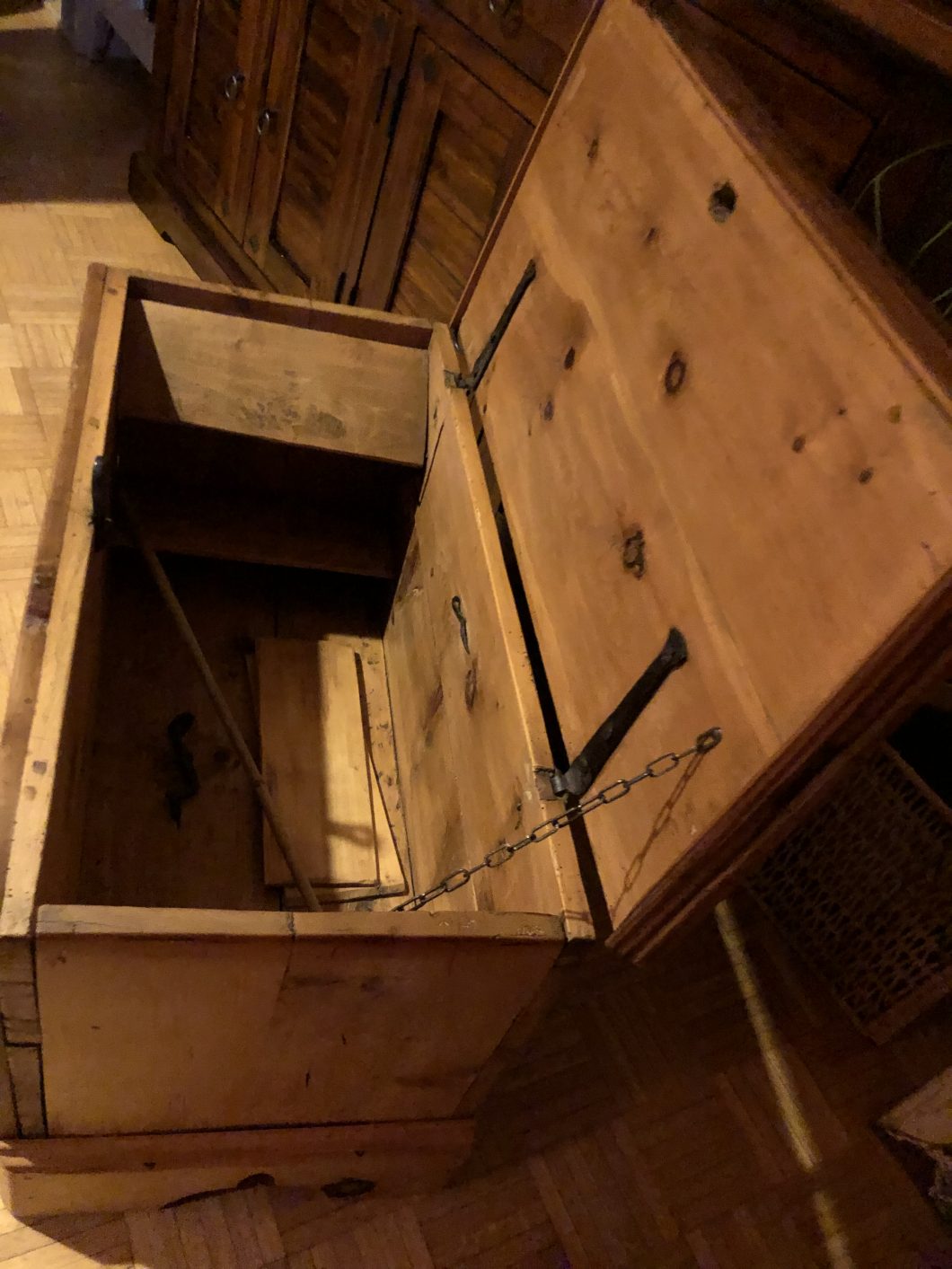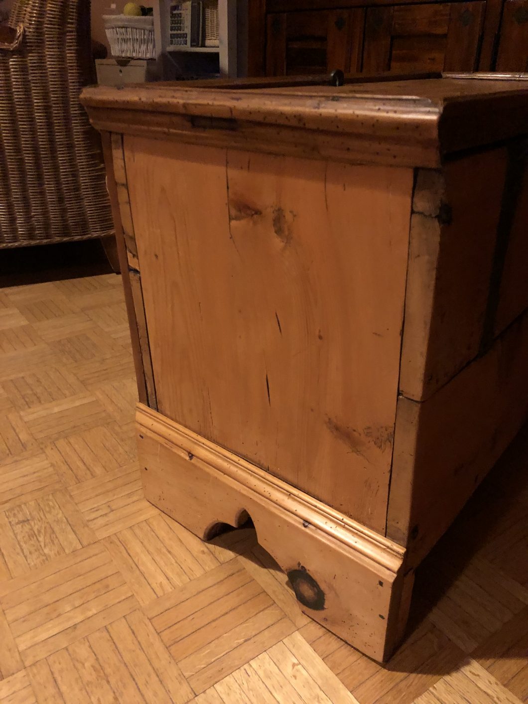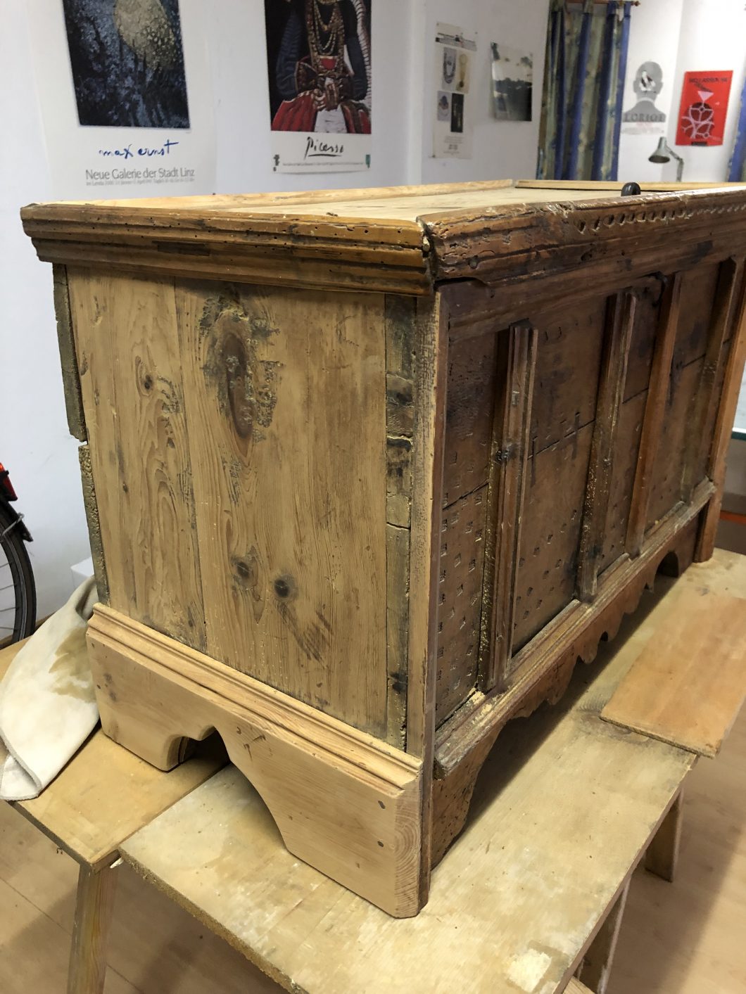 Dies war mein bis dato aufwendigstes Restaurationsprojekt. Die Kiste aus Oberösterreich hatte viele Holzwurmschäden, sehr viele Ecken waren ausgebrochen, abgeschlagen oder von den Holzwürmern zerfressen. Des Weiteren wurde sie schon mal mit neuen Seitenteilen bedacht, die die ursprünglichen Füße stützen sollten (da diese den Holzwürmern zum Opfer gefallen sind). Nachdem unterschiedliche Verzierungen in das Holz gepresst wurden, war Abschleifen auf der Vorderseite keine Option. Ich probierte es mit Abbeize – stellte jedoch rasch fest, dass die ursprüngliche Farbe wasserbasierend sein musste, da die Beize nicht griff. Somit entschied ich mich die Vorderseite vorsichtig mit Hand zu schleifen. Risse und Bruchstellen wurden mit Holzkitt bzw. Wachs behandelt.