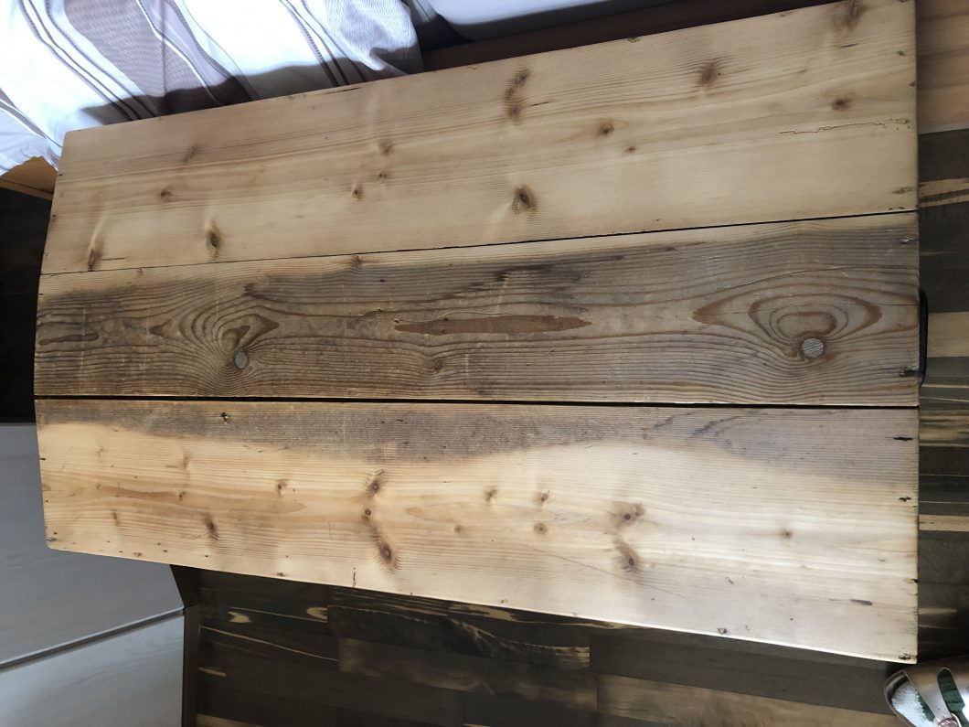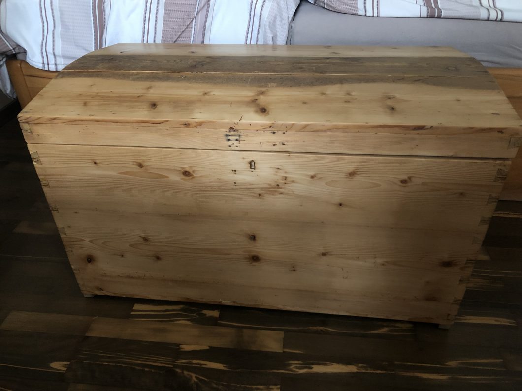 Der nächste Fund aus Bad Goisern! Diese alte Truhe habe ich im Heizungskeller entdeckt. Dabei handelt es sich um eine sogenannte Aussteuertruhe, jedoch untypisch einfach und schlicht gehalten. Die ursprünglichen Besitzer konnten mir leider nicht sagen, woher sie diese hatten („Die war ja immer schon da.“). Am Deckel habe ich bewusst einen Streifen nicht ganz weggeschliffen, um noch an die frühere Ansicht zu erinnern. Leider waren keine Originalbeschläge, ein sog. Überfallschloss, vorhanden. Die Truhe ist aus robustem Kiefer – nach dem Abschleifen und Ausbesserungen am Innenmantel (inkl. neuem Innenrahmen für den Deckel) wurde sie mit Antikwachs final behandelt. Die geeigneten Beschläge suche ich noch bis heute….