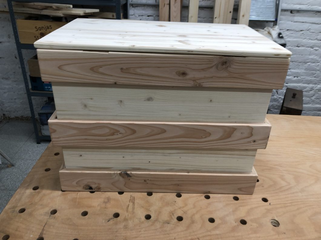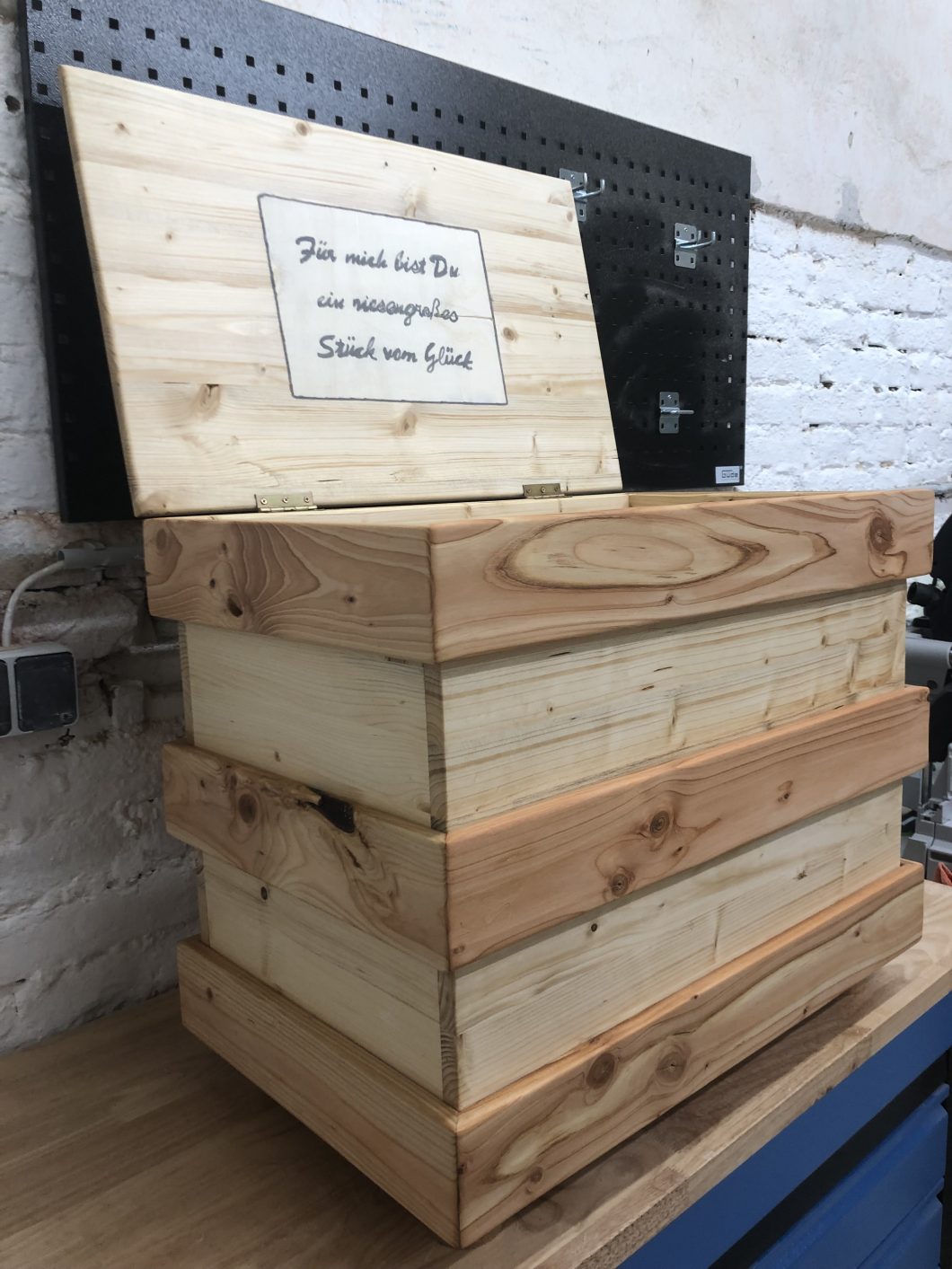 Als Weihnachtsgeschenk habe ich für meinen Freund diese Kiste aus Fichte und Douglasie gebaut. Besonders sind die drei Umrandungen im Gehrungsschnitt. Auf dem Deckel habe ich ein „H“ aus Buche eingefräst, damit die Kiste personalisiert ist. Sie steht auf Holzfüßen mit einem sehr persönlichen eingelegten Spruch auf der Innenseite des Deckels. Als Endverarbeitung habe ich die Kiste gewachst.
