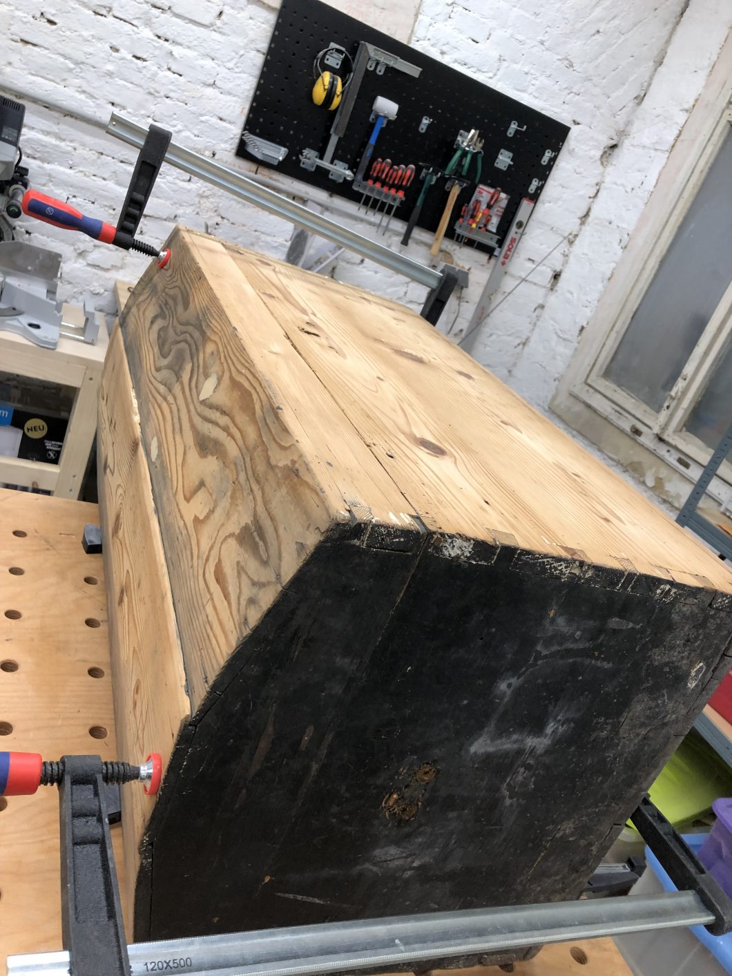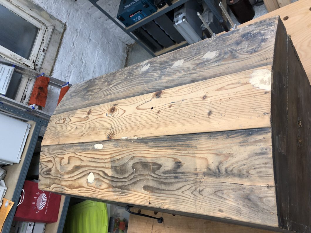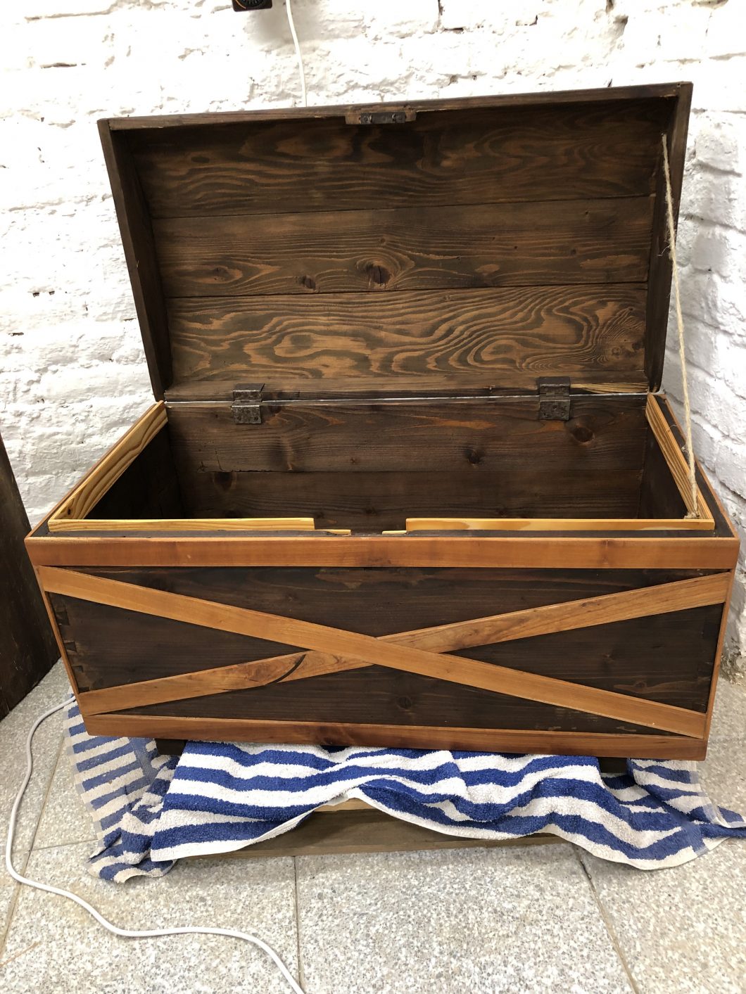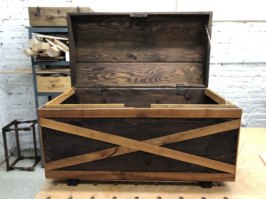 Diese alte Kiste aus dem Jahr 1933 (die Daten der ursprünglichen Besitzerin waren auf der Innenseite des Deckels vermerkt) habe ich bei einer Wohnungsauflösung gekauft. Die Schwalbenschwänze waren in keinem guten Zustand. Ferner hatten Holzwürmer die Kiste befallen. Nachdem die Kiste schwarz gebeizt wurde, war im ersten Schritt nicht sichtbar, das zur Ausbesserung von unterschiedlichen Stellen heller Holzkitt verwendet wurde. Ich habe einen Innenrahmen für die Kiste gebaut, um sie zu stabilisieren und die Schwalbenschwänze restauriert. Ferner habe ich sie in Walnuss gebeizt und Außen mit Buchenholz verziert. Des Weiteren habe ich eine Umrandung gebaut. Sie schmückt heute das Kinderzimmer des Sohnes einer sehr lieben Freundin von mir.