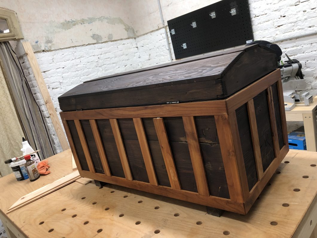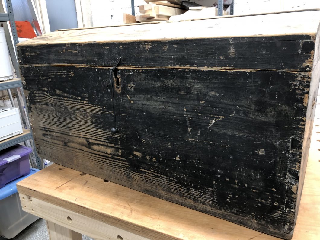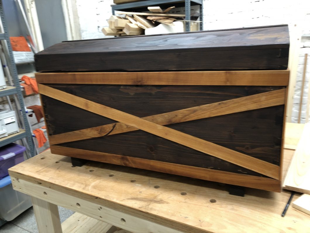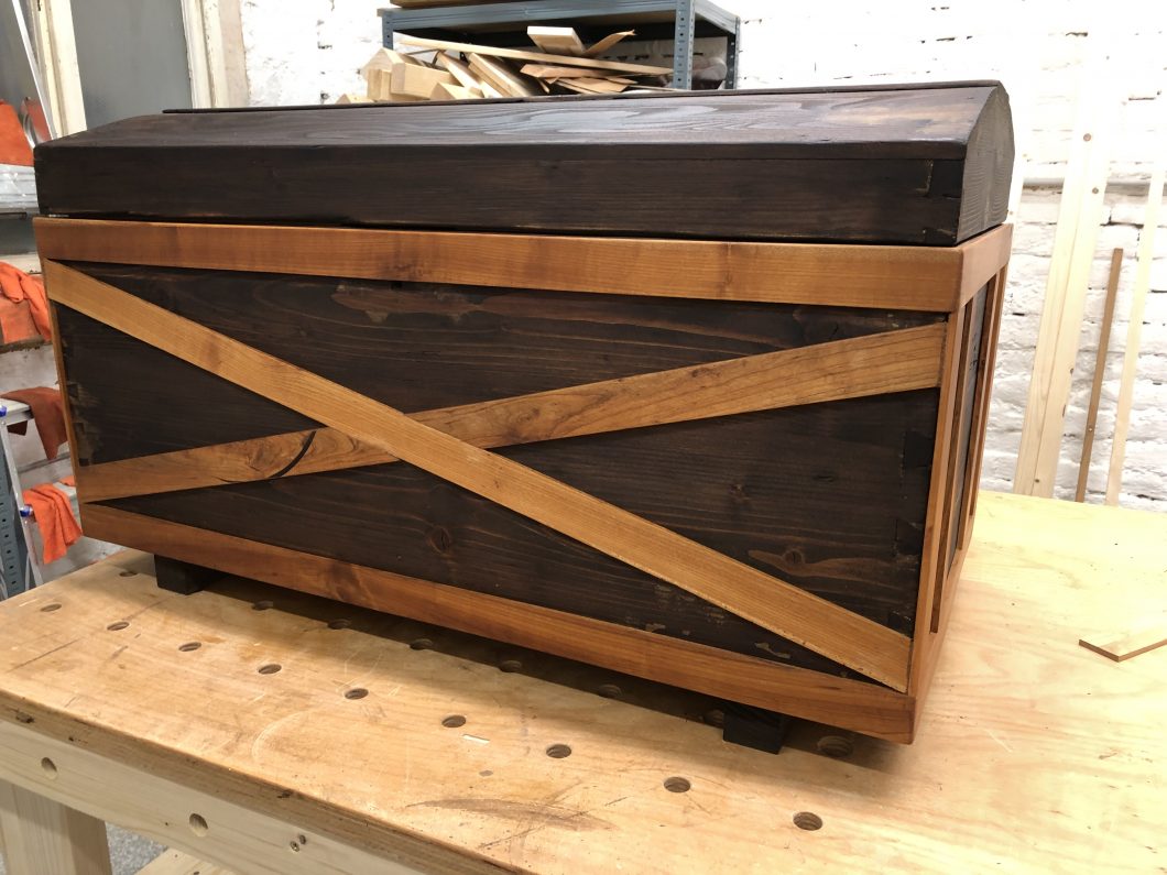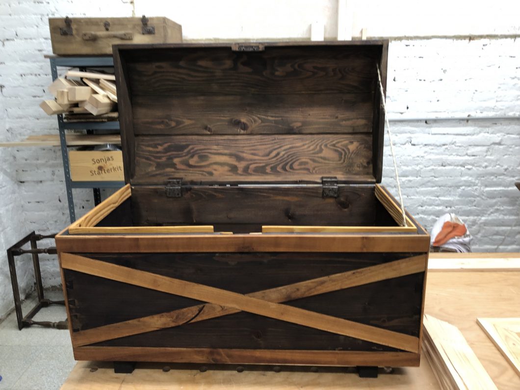 Diese alte Kiste aus dem Jahr 1933 (die Daten der ursprünglichen Besitzerin waren auf der Innenseite des Deckels vermerkt) habe ich bei einer Wohnungsauflösung gekauft. Die Schwalbenschwänze waren in keinem guten Zustand. Ferner hatten Holzwürmer die Kiste befallen. Nachdem die Kiste schwarz gebeizt wurde, war im ersten Schritt nicht sichtbar, das zur Ausbesserung von unterschiedlichen Stellen heller Holzkitt verwendet wurde. Ich habe einen Innenrahmen für die Kiste gebaut, um sie zu stabilisieren und die Schwalbenschwänze restauriert. Ferner habe ich sie in Walnuss gebeizt und Außen mit Buchenholz verziert. Des Weiteren habe ich eine Umrandung gebaut. Sie schmückt heute das Kinderzimmer des Sohnes einer sehr lieben Freundin von mir.
