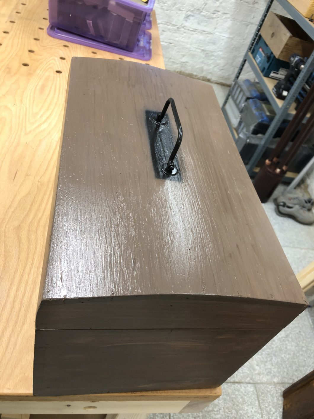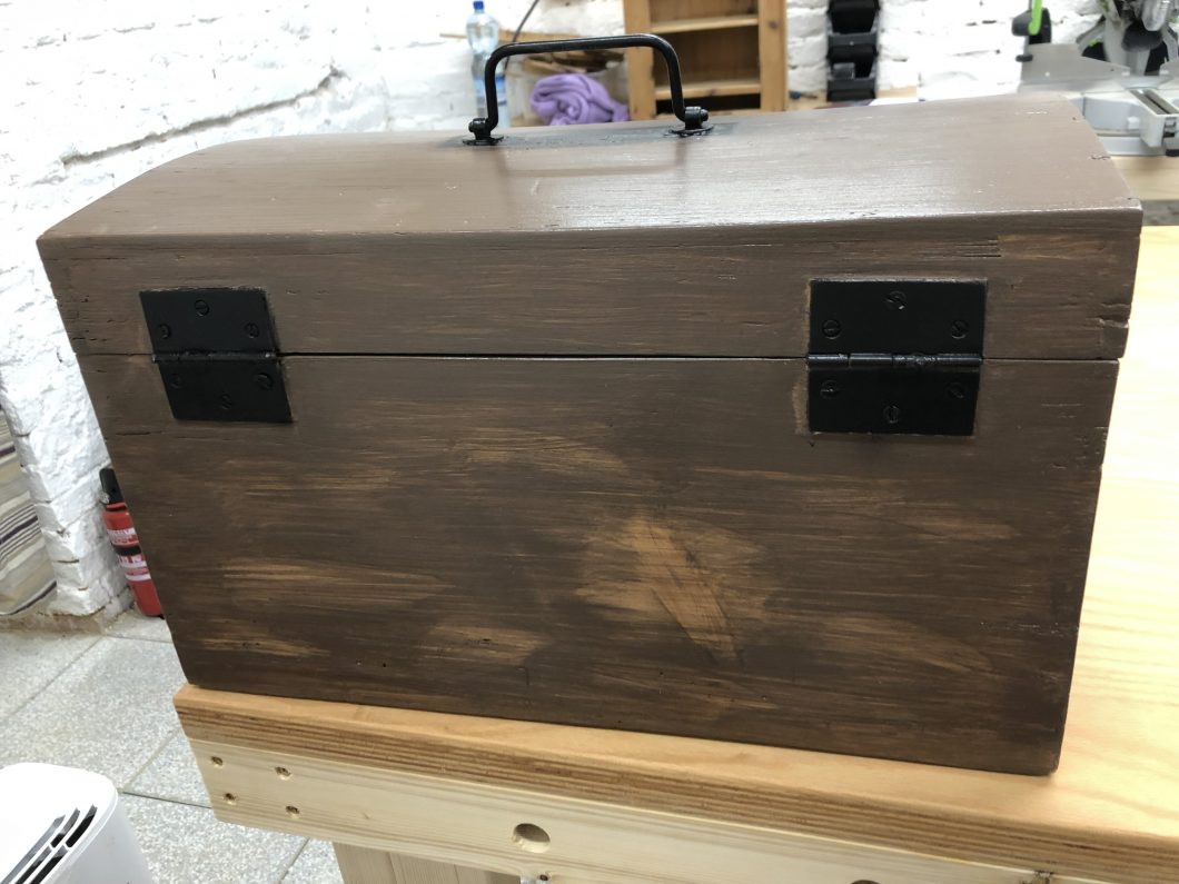 Im tiefsten Mühlviertel in OÖ habe ich einen Bauernhof gefunden, welcher alte restaurierungsbedürftige Gegenstände verkauft. Von Truhen über Tische, Kästen, Stühle und sonstige Kuriositäten. Diese alte mittelgroße Kiste habe ich dort erstanden und danach zu neuem Leben erweckt. Sie besteht aus Kiefernholz und hatte sehr viele Holzwurmspuren. Schön ist, dass die Beschläge noch gut erhalten waren. Sie hat bei der Schwester meines Freundes nun ein neues Zu Hause gefunden.