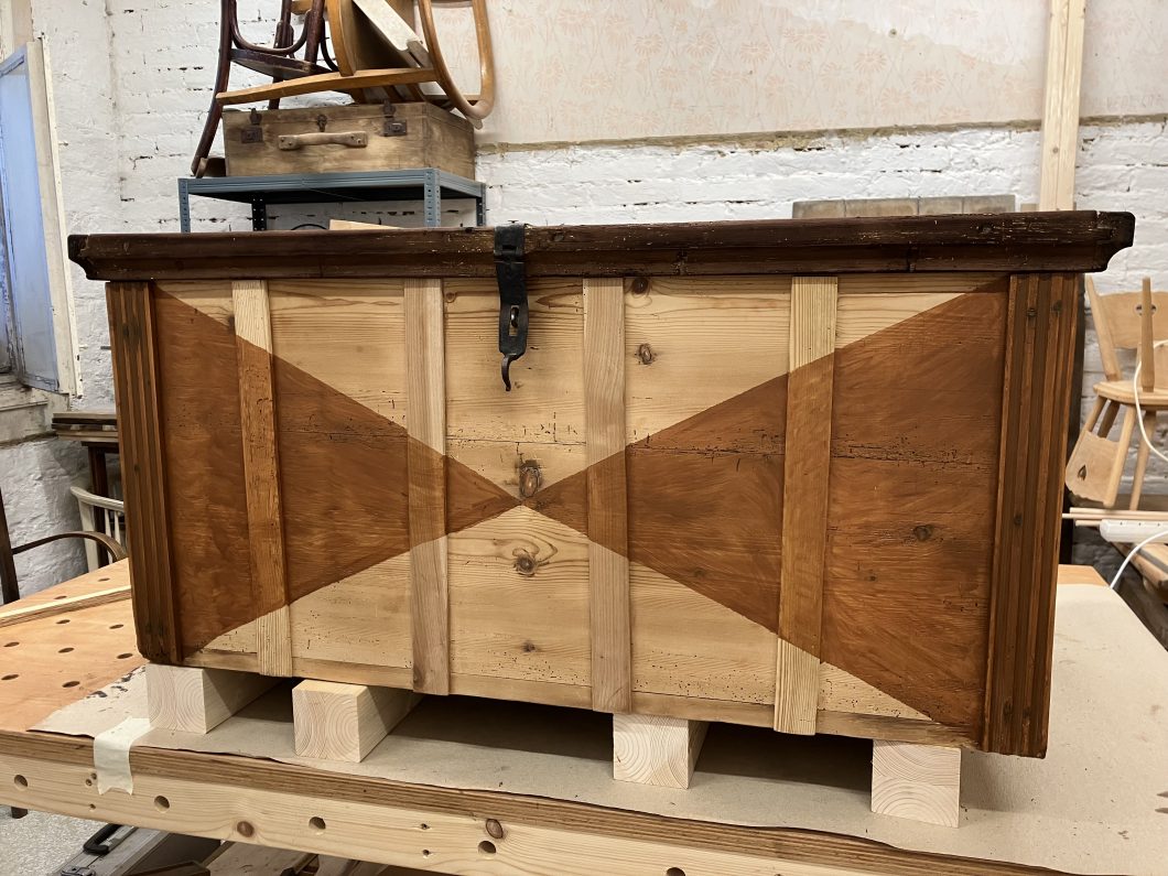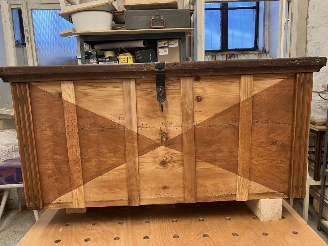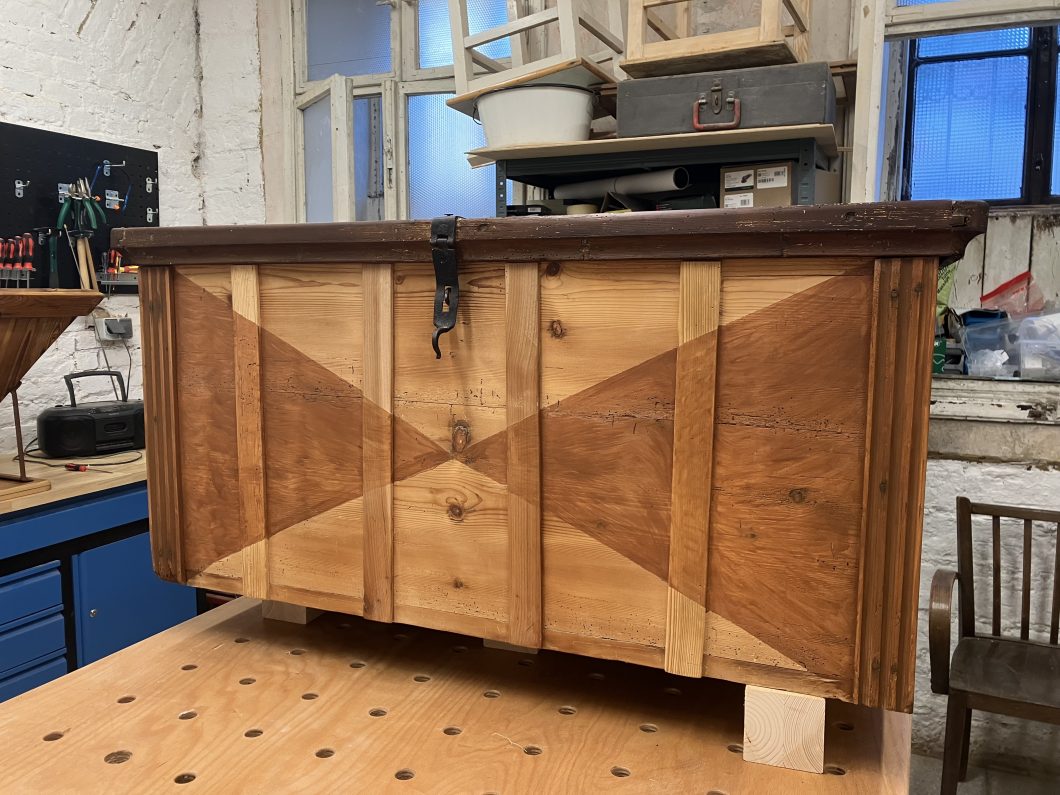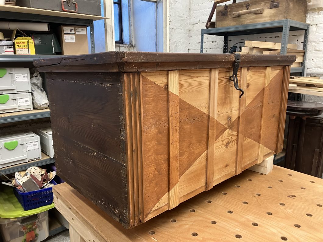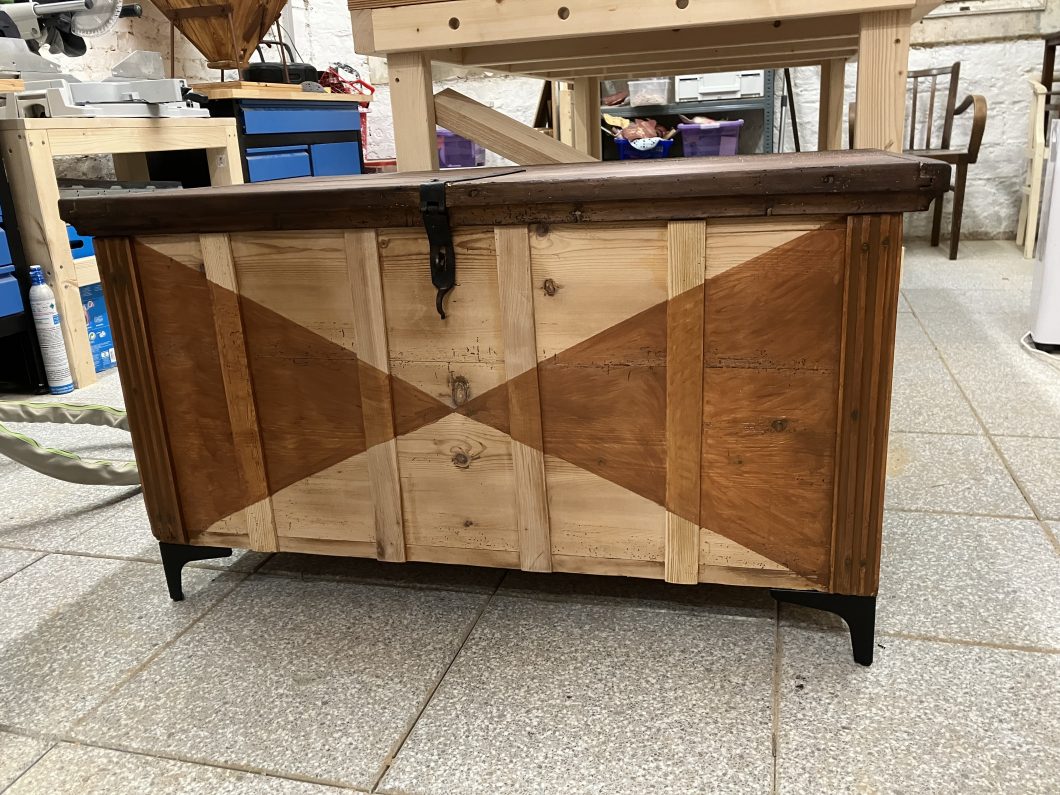 Diese alte Kiste habe ich ebenfalls in OÖ erstanden. Auch hier waren vor allem die Verbindungen zu restaurieren. Schön sind die vorhandenen alten Beschläge. Die schönen gerillten Längsverzierungen konnte ich erhalten und restaurieren. Um die Symmetrie zu gewährleisten, habe ich auf der Vorderseite noch weitere Längsverzierungen angefügt – damit die Kiste moderner wirkt, habe ich eine geometrische Lösung als Verzierung für die Frontseite gewählt. Die Kiste ist gewachst bzw. ist das geometrische Muster in eine Teak Lasur getaucht. Der Rest der Kiste wurde innen und außen in Walnuss gebeizt. 10 cm lange schwarze Metallfüße runden den Look ab.