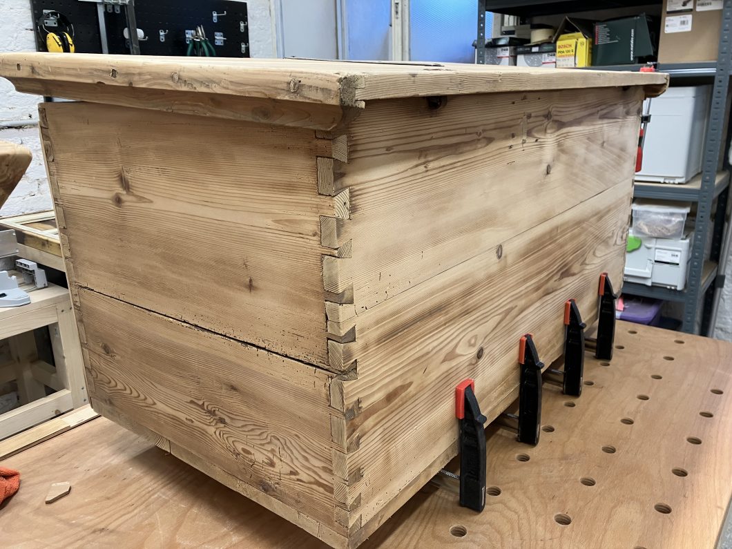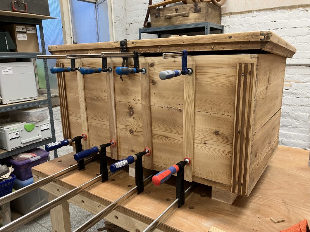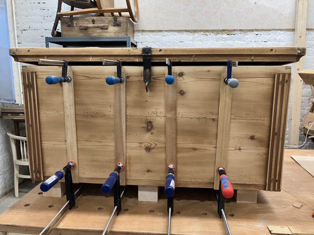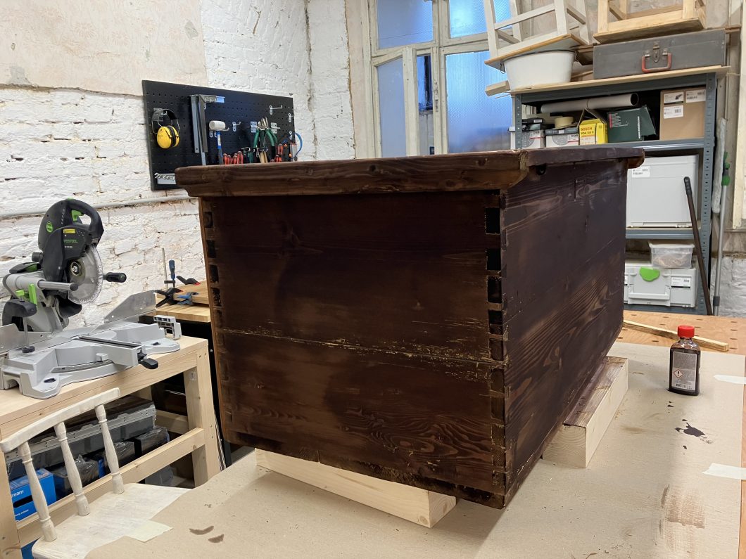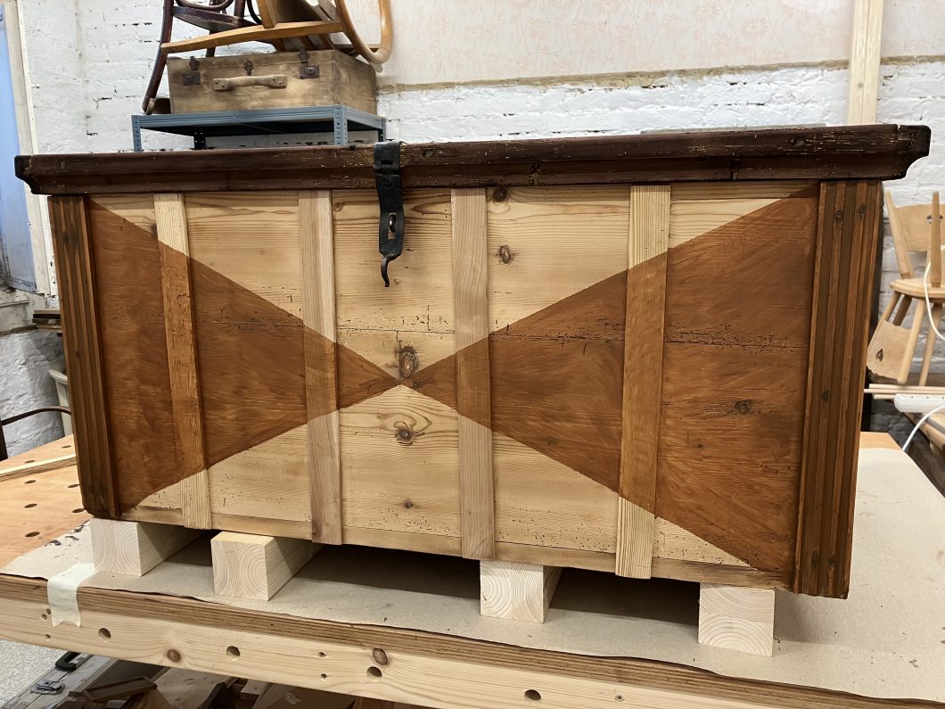 Diese alte Kiste habe ich ebenfalls in OÖ erstanden. Auch hier waren vor allem die Verbindungen zu restaurieren. Schön sind die vorhandenen alten Beschläge. Die schönen gerillten Längsverzierungen konnte ich erhalten und restaurieren. Um die Symmetrie zu gewährleisten, habe ich auf der Vorderseite noch weitere Längsverzierungen angefügt – damit die Kiste moderner wirkt, habe ich eine geometrische Lösung als Verzierung für die Frontseite gewählt. Die Kiste ist gewachst bzw. ist das geometrische Muster in eine Teak Lasur getaucht. Der Rest der Kiste wurde innen und außen in Walnuss gebeizt. 10 cm lange schwarze Metallfüße runden den Look ab.