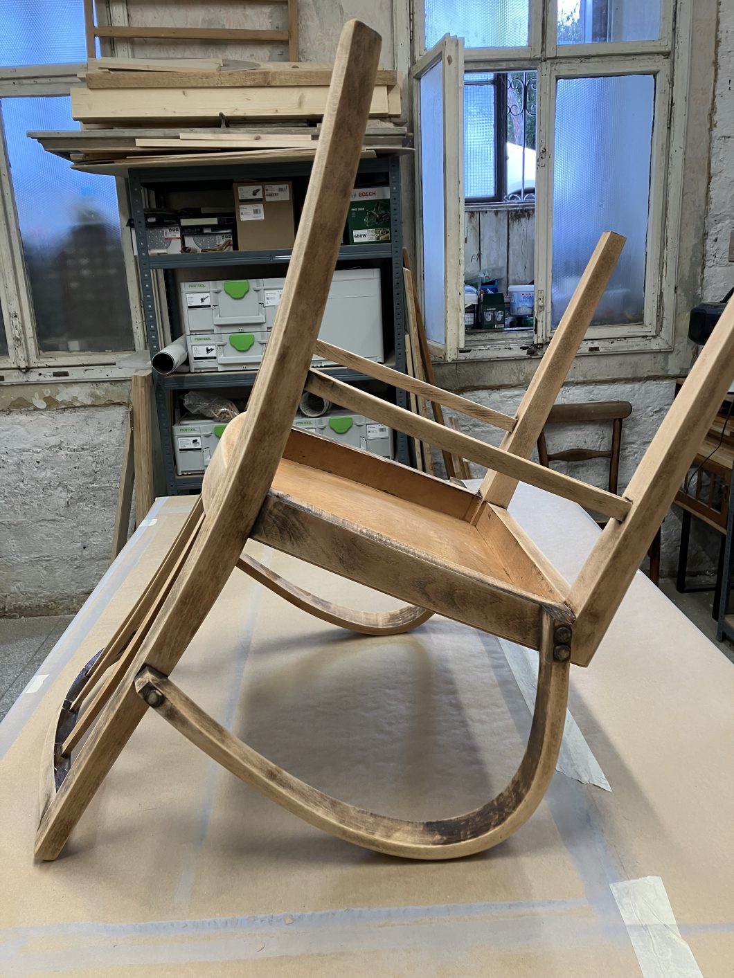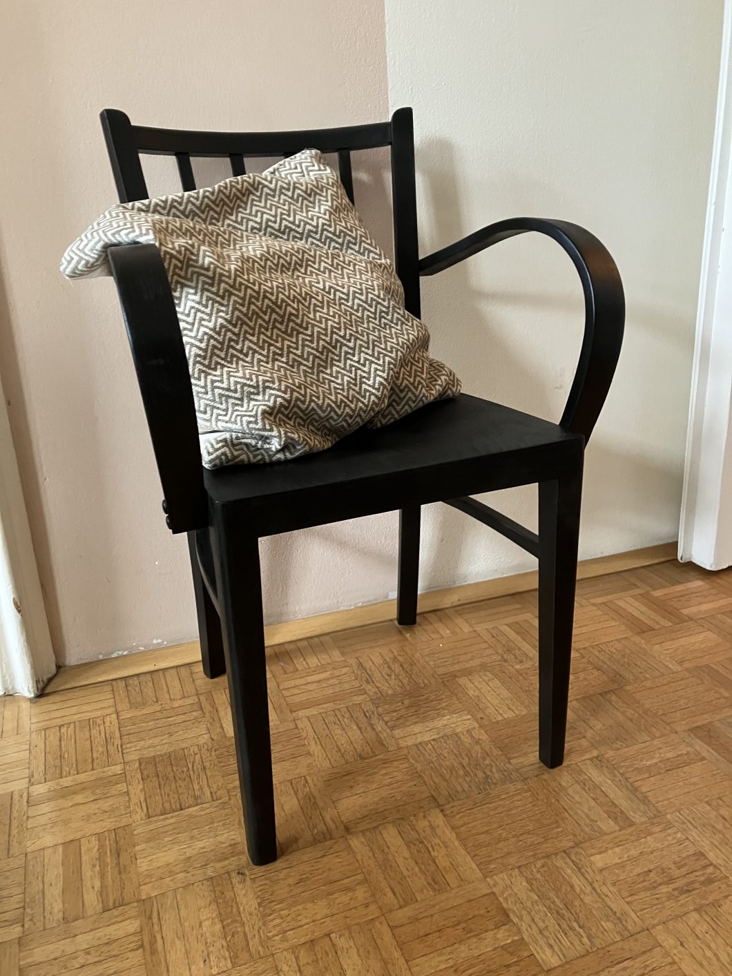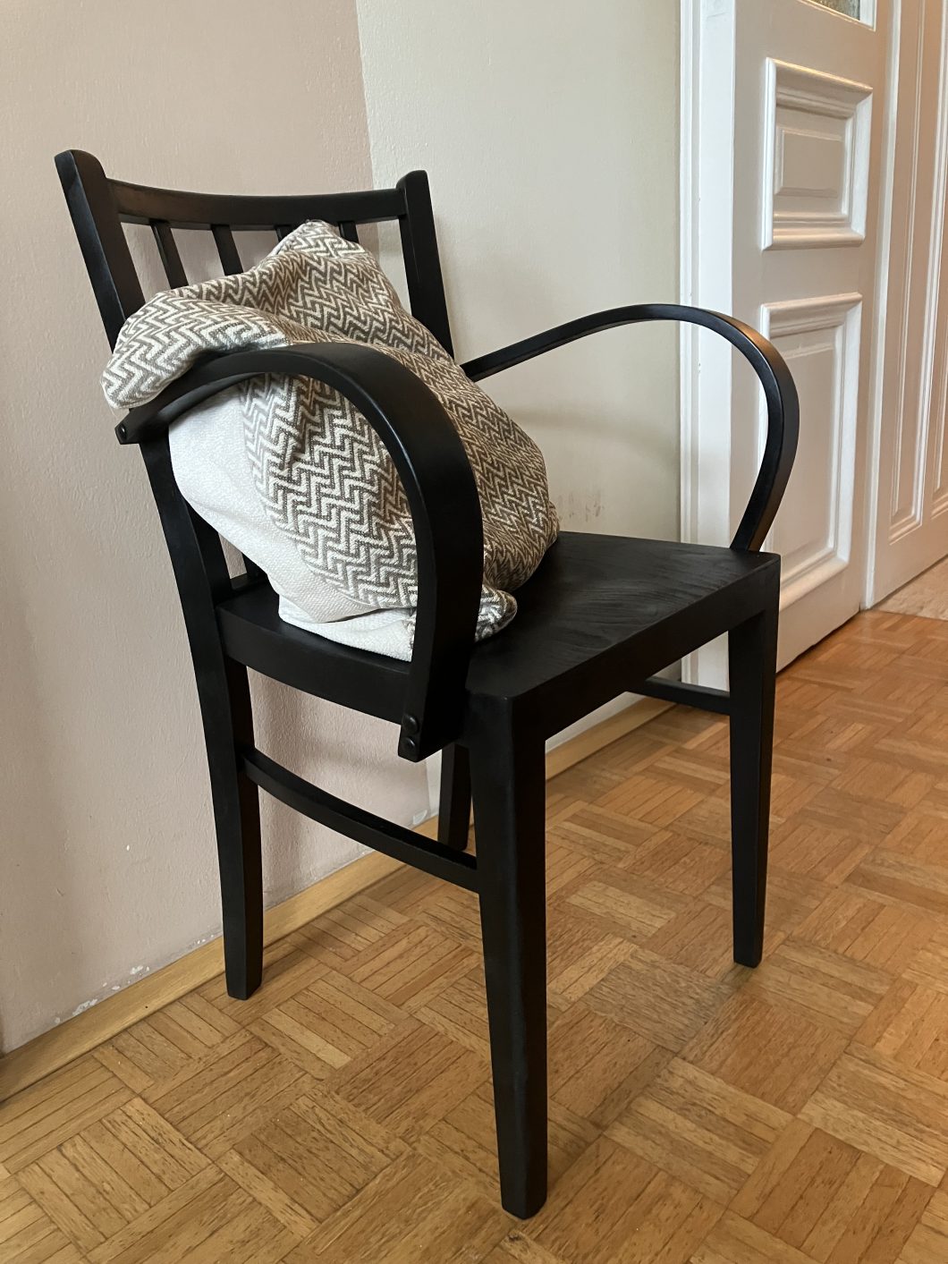 Dieser Sessel stammt aus einer Verlassenschaft. Teile davon waren leider in keinem guten Zustand, da er in der Vergangenheit sehr lieblos behandelt wurde. Durch viel Zeit, Mühe und Geduld wurden die Sprossen restauriert – jetzt erstrahlt er in neuem Glanz. Besonderes Detail sind die geschwungenen Lehnen, die in sehr gutem Zustand sind und die knopfmäßige Verbindung.