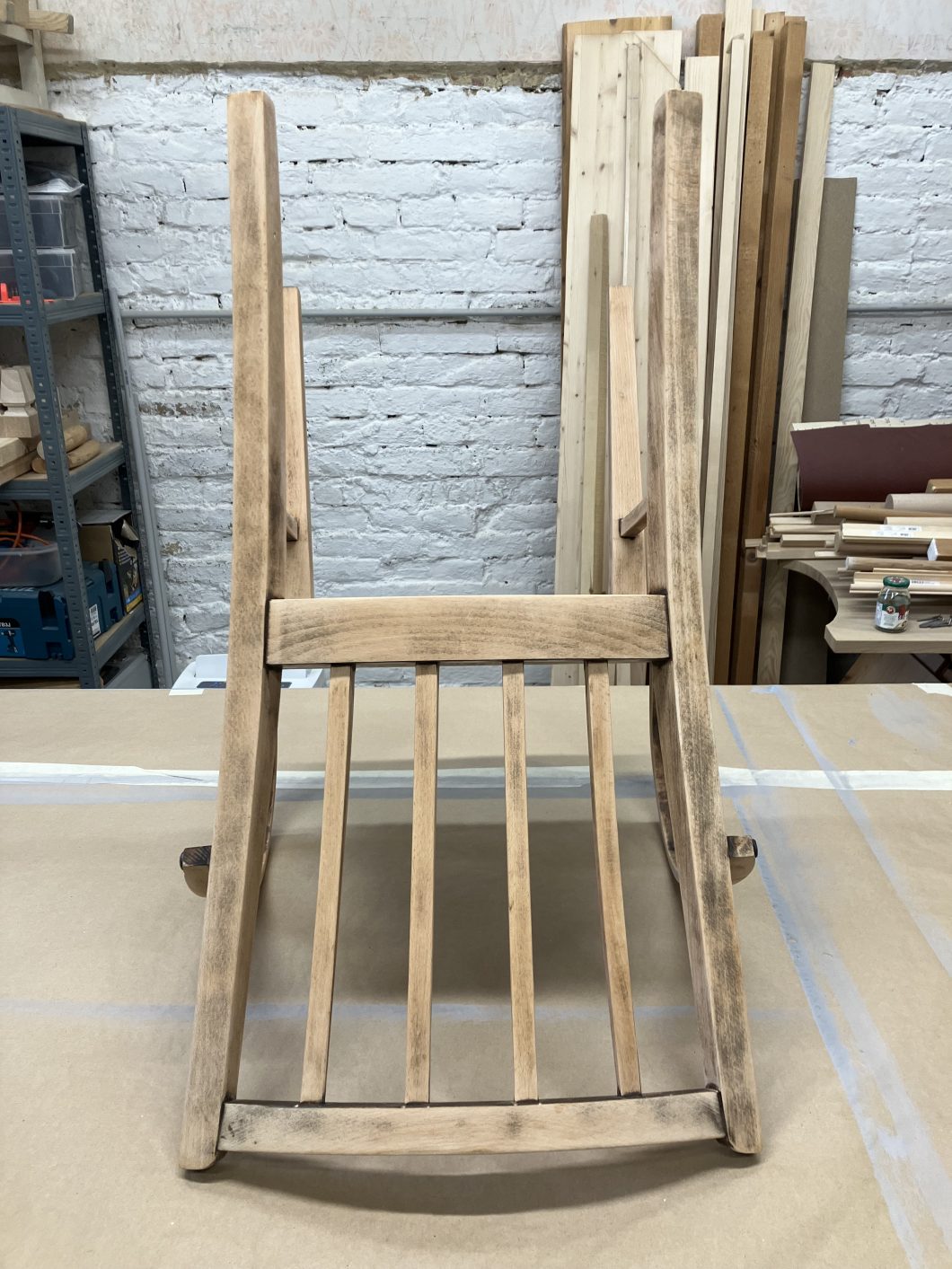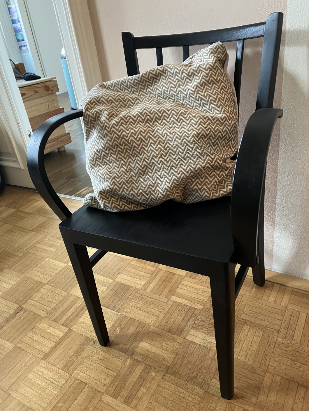 Der Sessel ist aus Vollholz, die Sitzfläche aus Sperrholz.