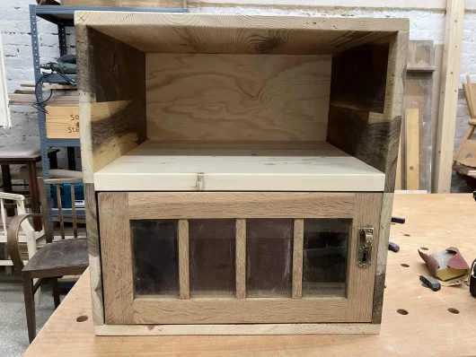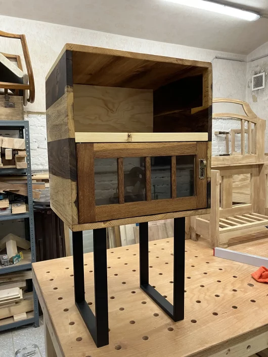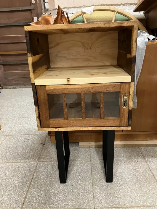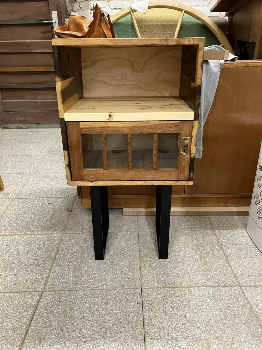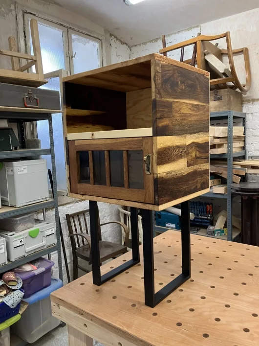 Am Anfang war das Eichentürchen, welches ich in einem Trödelladen in OÖ gefunden habe. Danach hab ich aus unterschiedlichen Hölzern (Senna Holz, Kiefer, Fichte) das Kasterl darumherum gebaut. Die schwarzen Metallfüße geben einen modernen Touch für dieses Kasterl, welches für unterschiedliche Dinge (Bücher, Flaschen, Fernseher etc.) verwendet werden kann. Das Finish wurde mit Wachs gemacht. Das Kasterl ist noch zu haben.