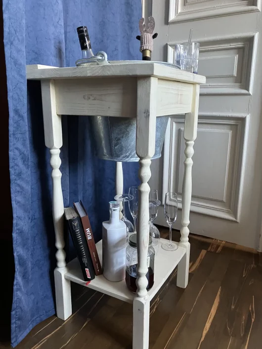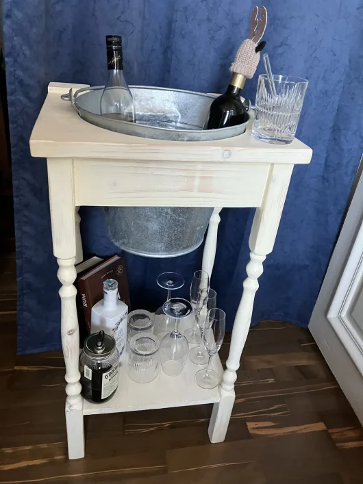 Diesen umgebauten Waschtisch hat mir meine Freundin Heidi vom Flohmarkt mitgebracht. Ursprünglich handelte es sich um einen alten Waschtisch, auf dem noch sehr viele Kleber- und Farbreste zu finden waren. Ich habe diesen Tisch abgeschliffen, die Löcher geschlossen und daraus einen ansehnlichen Barboy gemacht. Mit dem Metallkübel können bis zu 4 Flaschen gleichzeitig gekühlt werden. Gläser und Barutensilien können auf die untere Ablage gestellt werden. Der Barboy hat im 23. Bezirk in Wien ein neues zu Hause gefunden.