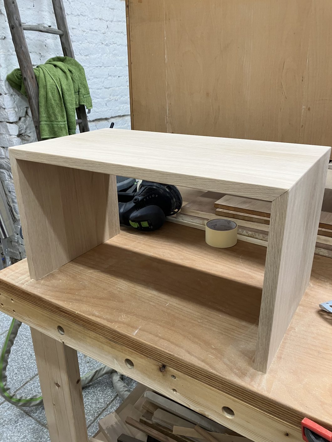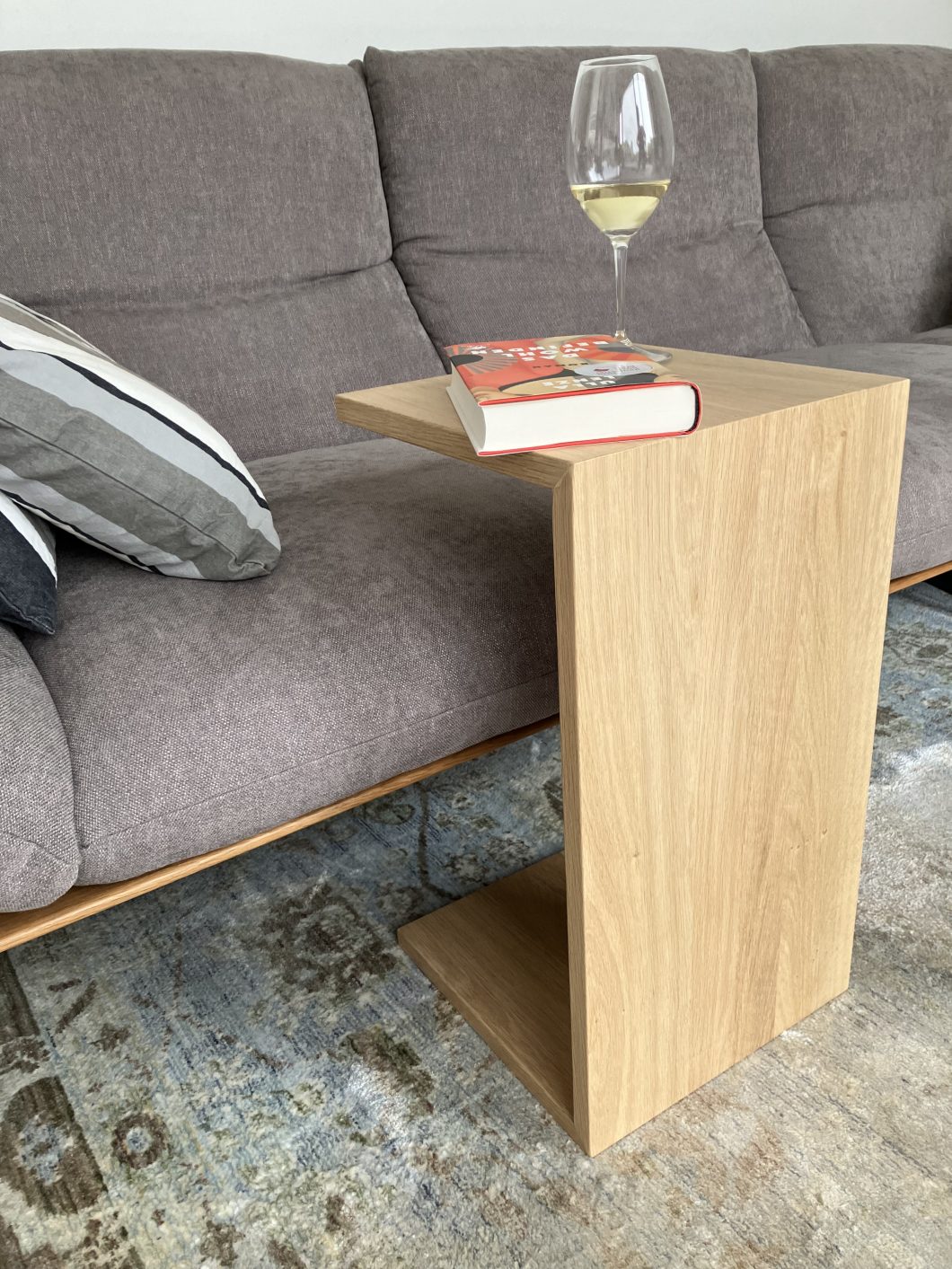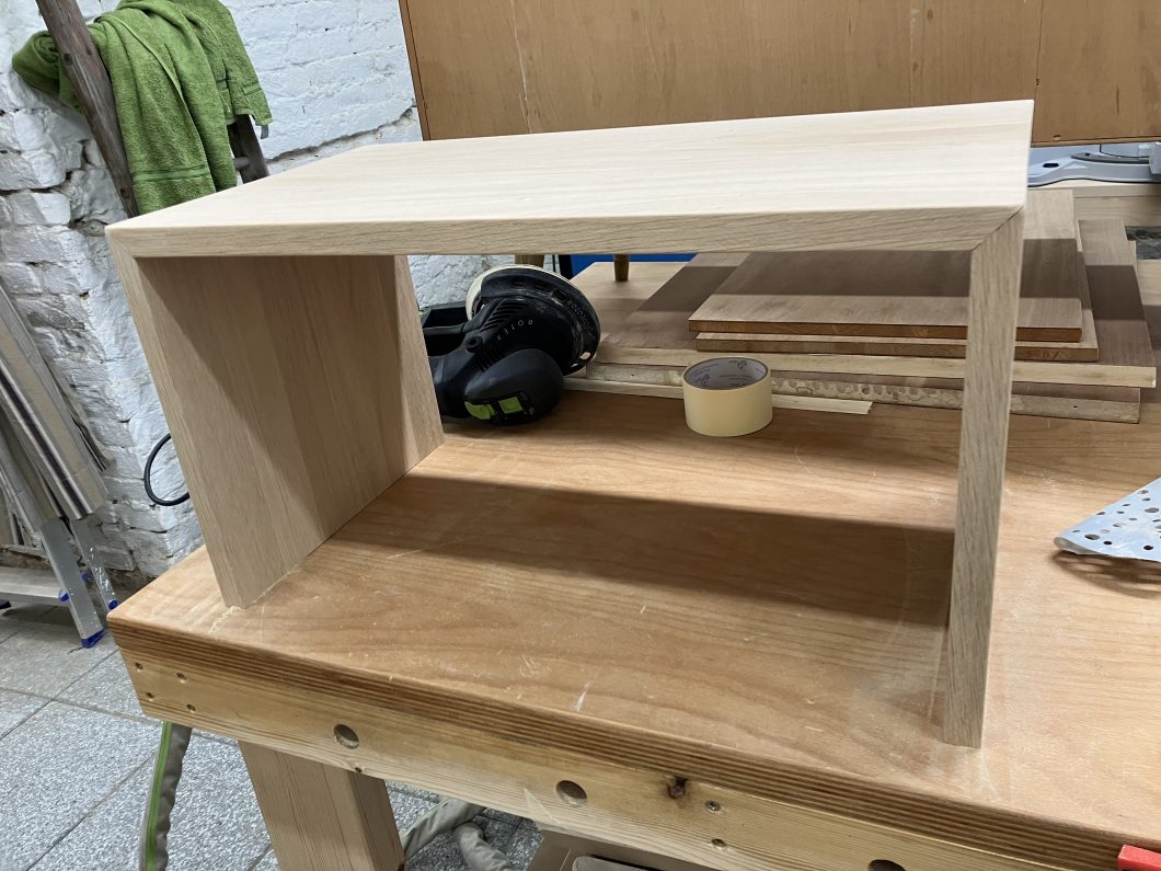 Der Wunsch war aus Eiche dieses Möbelstück herzustellen. Wichtig war, dass die Maserung des Holzes dem Verlauf folgt. Dadurch „fließt“ dieses Möbelstück optisch, nicht zuletzt weil es auch auf Gehrung geschnitten wurde.
