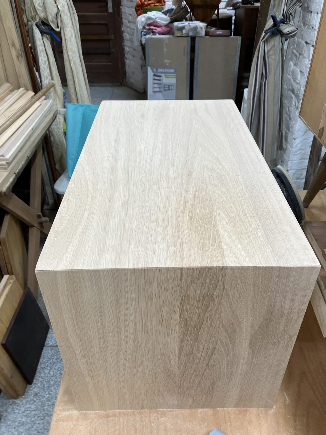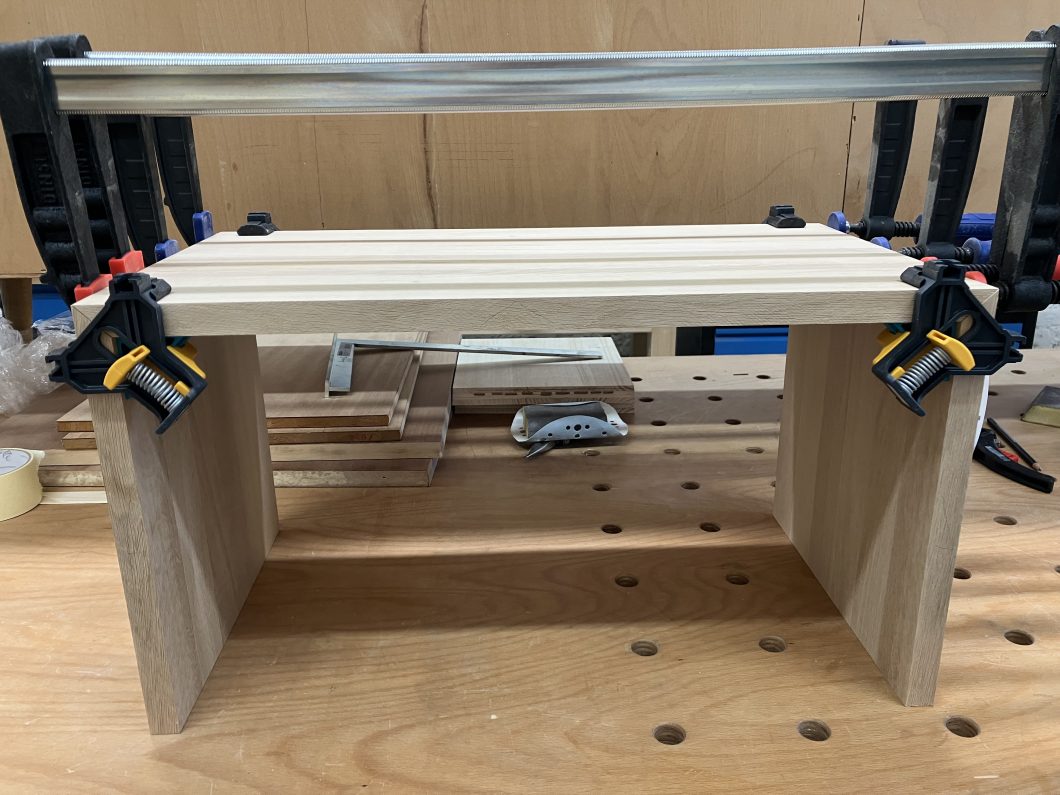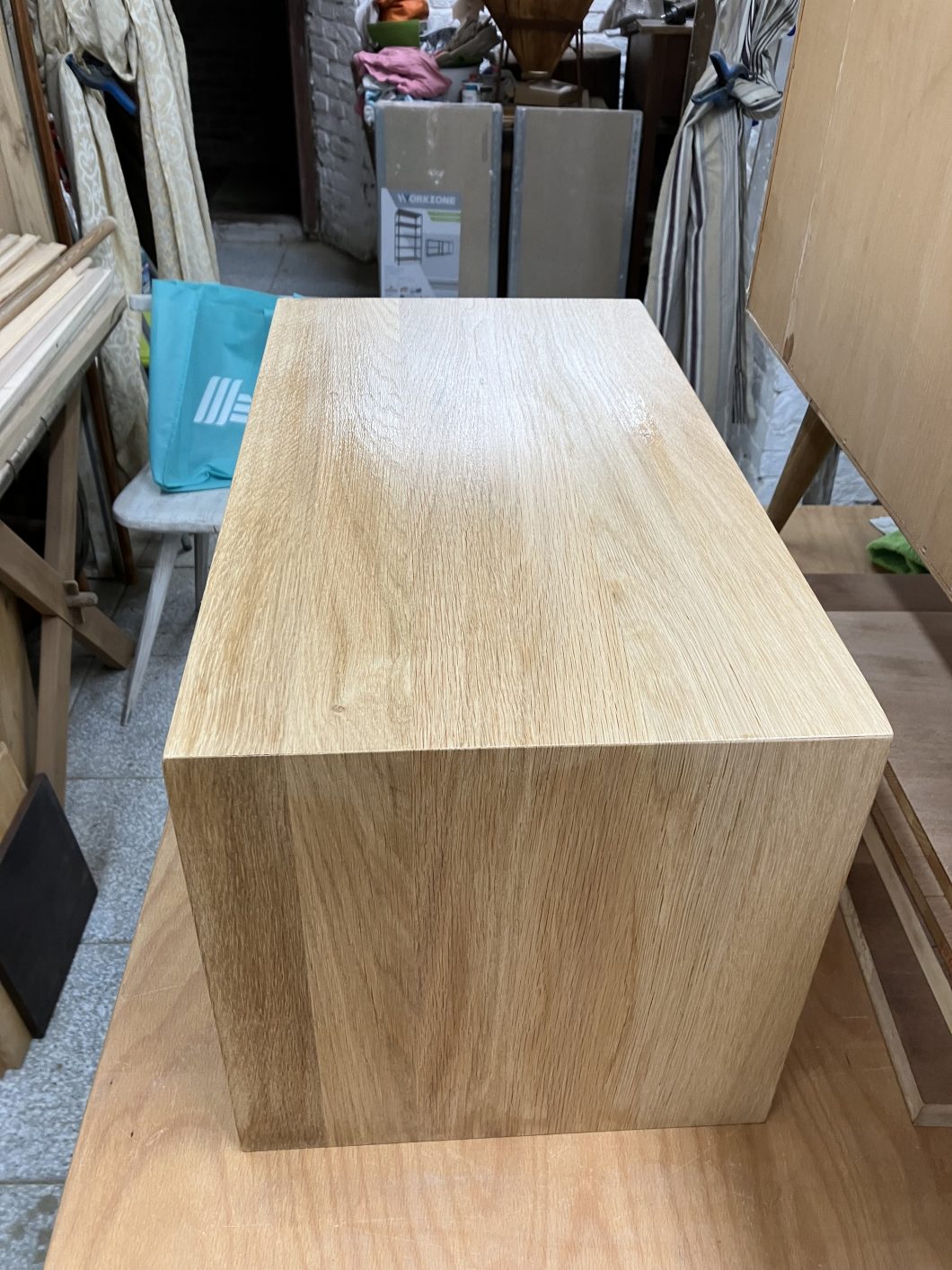 Der Wunsch war aus Eiche dieses Möbelstück herzustellen. Wichtig war, dass die Maserung des Holzes dem Verlauf folgt. Dadurch „fließt“ dieses Möbelstück optisch, nicht zuletzt weil es auch auf Gehrung geschnitten wurde.
