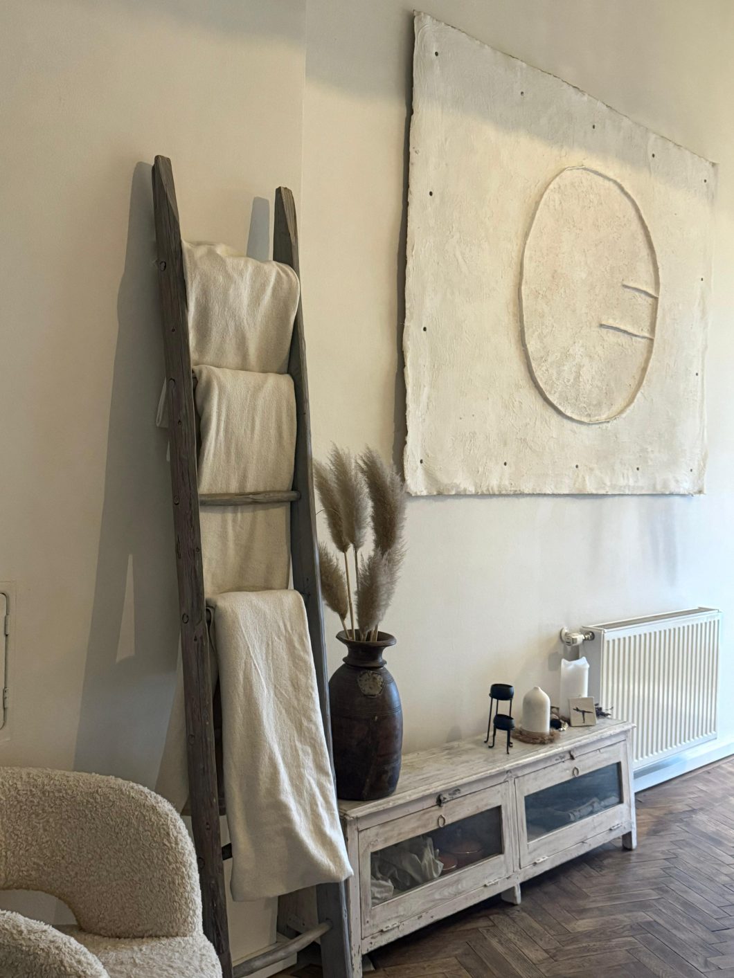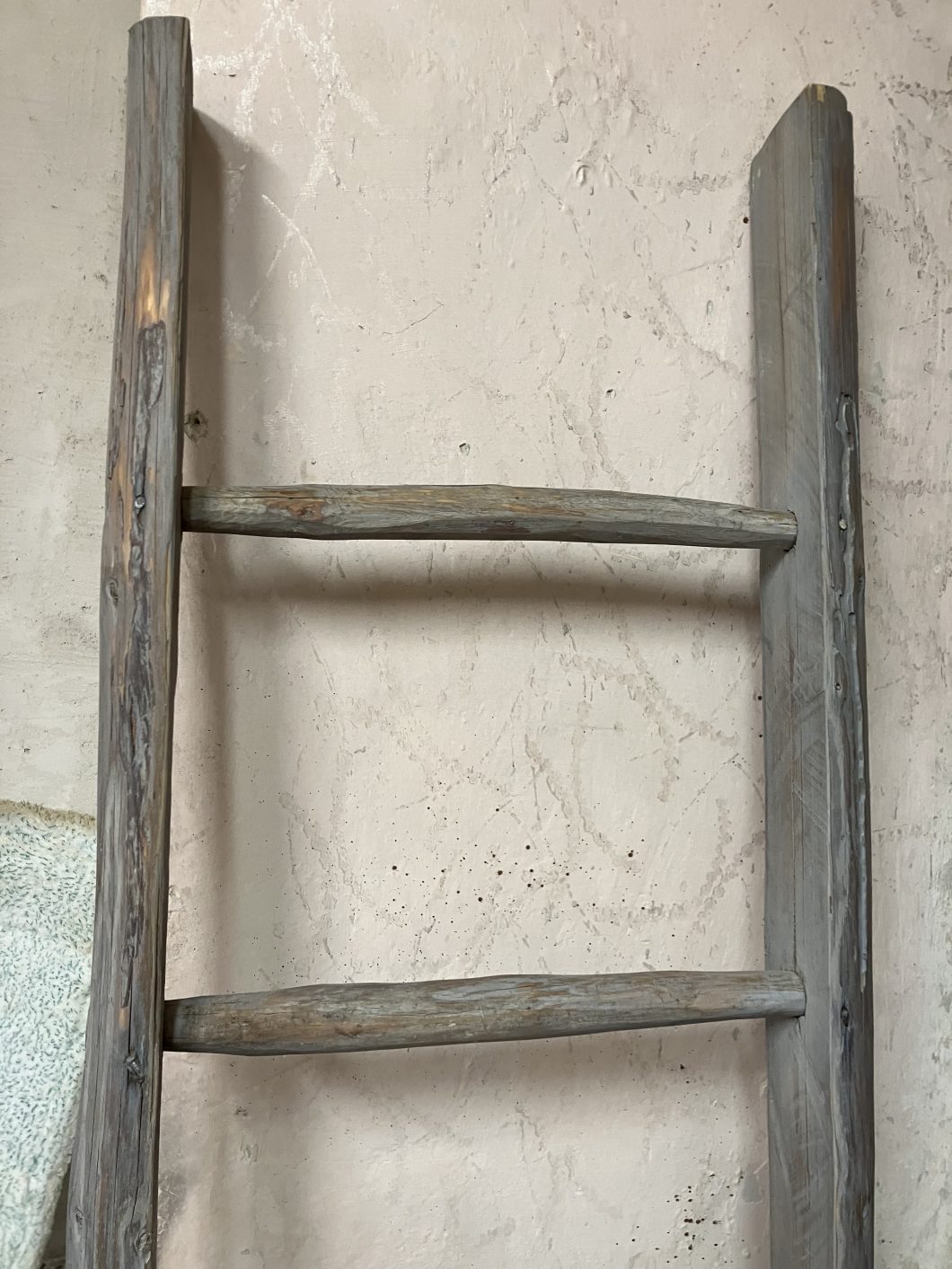 Diese alte Heustadl-Leiter habe ich von meinem Lieblingsladen in Oberösterreich erstanden. Lange stand sie in meiner Werkstatt als eine Seminarteilnehmerin während meiner PCM Ausbildung meinte, dass sie einen Platz für ihre Wolldecken in ihrem Yoga Studio benötigte.