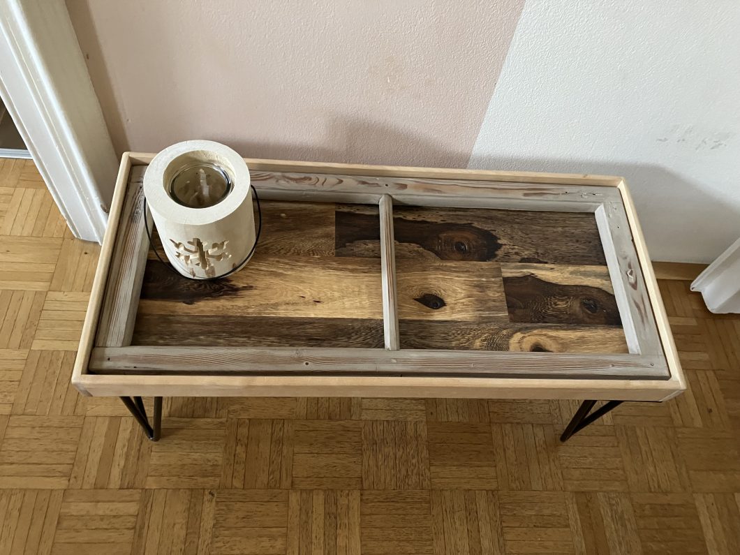 Die Inspiration für diesen Couchtisch war die Tischplatte aus Sennaholz und ein alter Fensterladen. Der Fensterladen wurde abgeschliffen und in Taupe Kreidefarbe gestrichen. Die Umrandung ist aus Birkenholz, die Tischplatte aus Sennaholz. Der alte Fensterladen stammt von einer Scheune aus Oberösterreich.