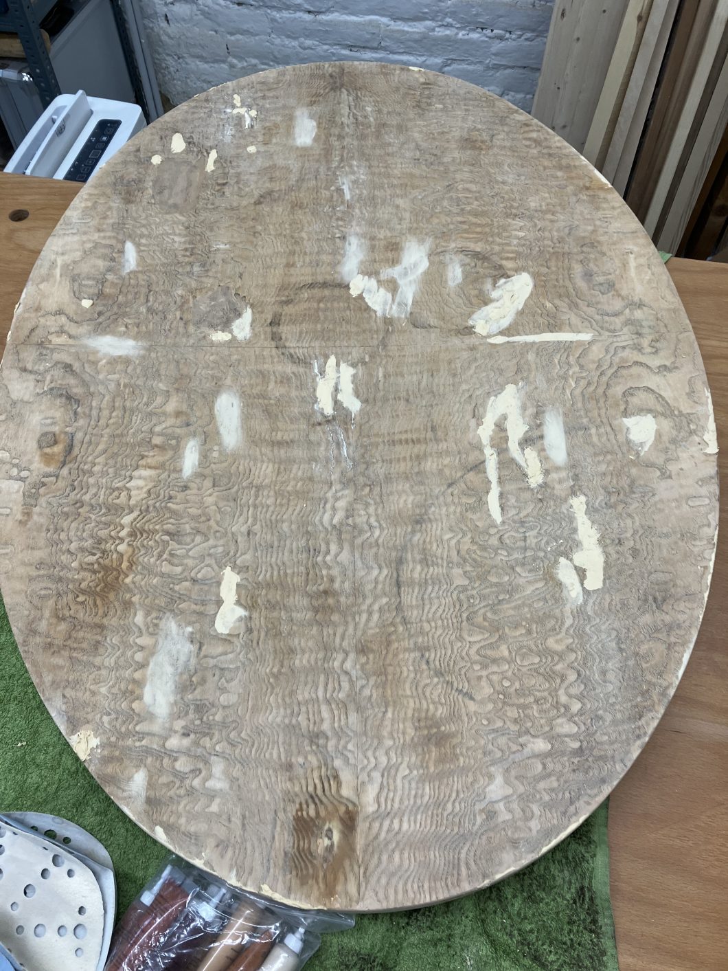 Der Besitzer dieses schönen Stückes hatte ihn jahrelang in der Garage stehen. Der Tisch wurde von seinem Großvater gebaut und war deutlich in die Jahre gekommen. Die wellenförmige schöne Furnier war geplatzt, in die Jahre gekommen, hatte Löcher und Wasserschäden. Wieder einmal ein aufwendiges Projekt.