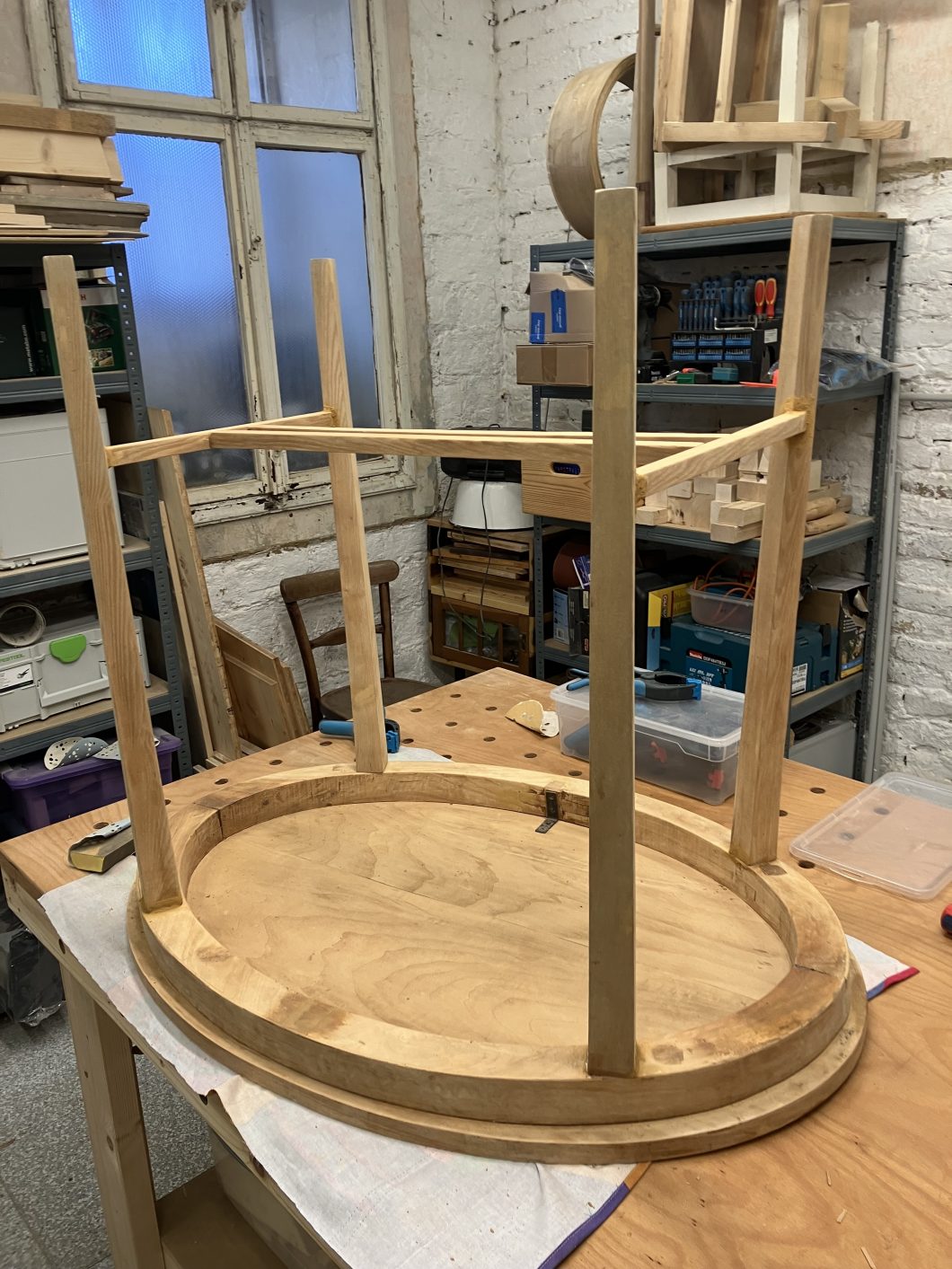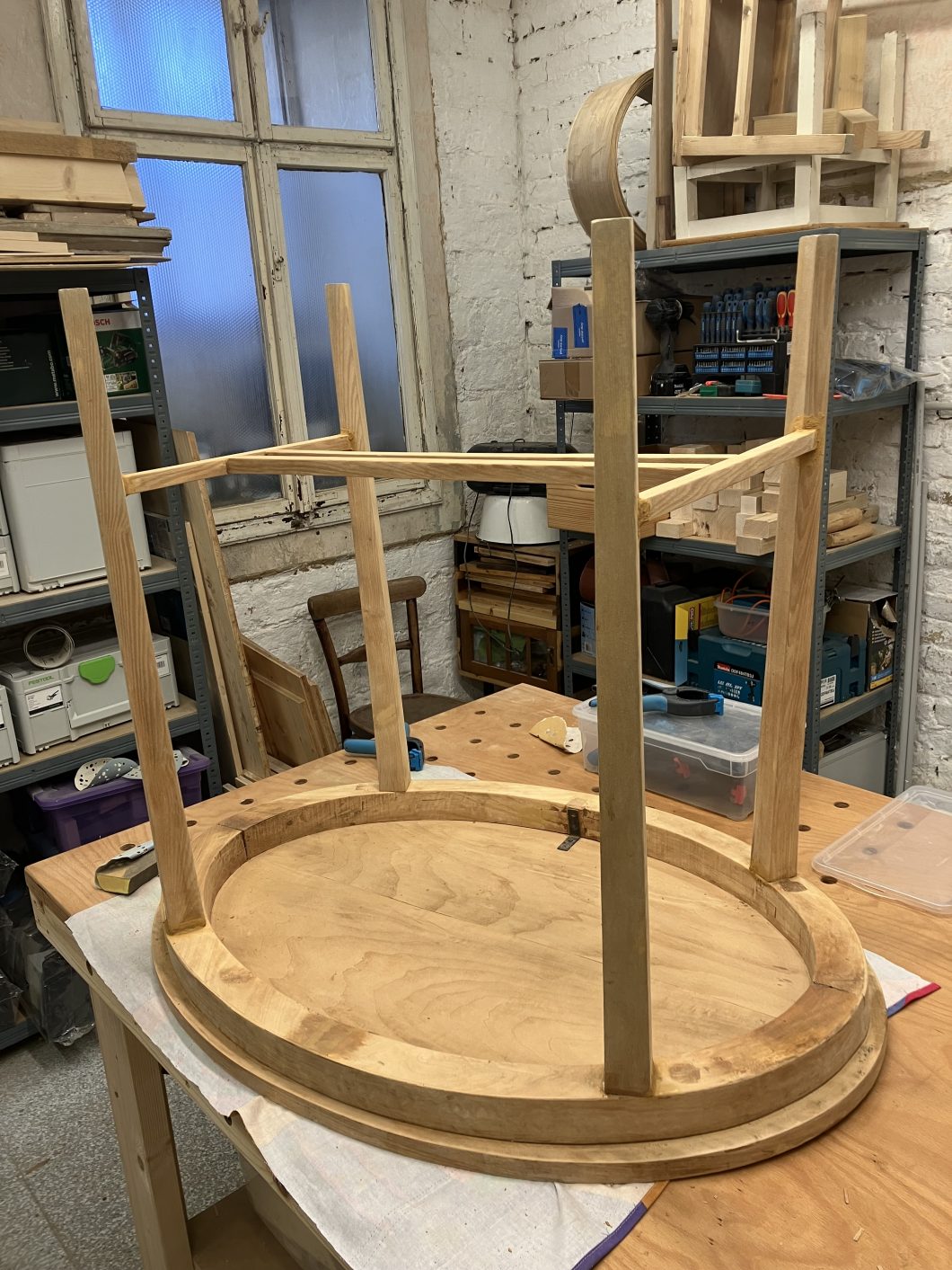 Der Tisch hat jetzt eine Glasplatte zum Schutz der Oberfläche und steht jetzt (glücklicherweise) nicht mehr in der Garage.