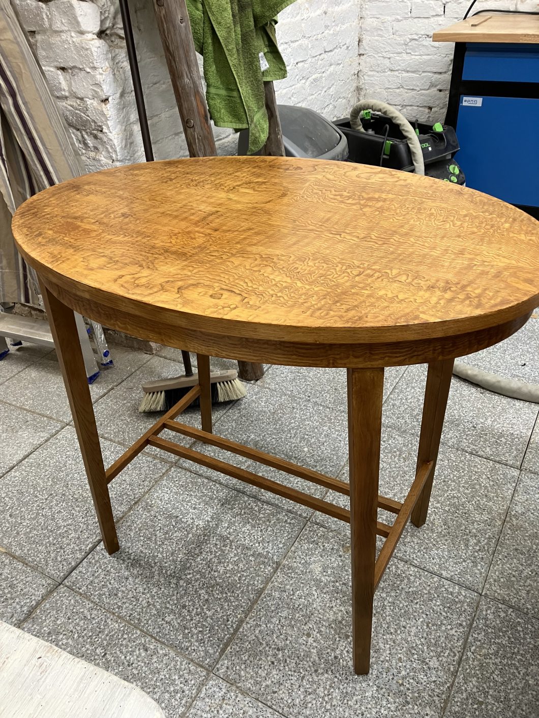 Ein Tausch der Furnier war nicht möglich, da diese Furnier (Wellenfurnier oder auch Kunstfurnier, wie ich gelernt habe) heute kaum mehr hergestellt wird. So habe ich den Tisch soweit wie möglich restauriert. Das Ergebnis kann sich sehen lassen.